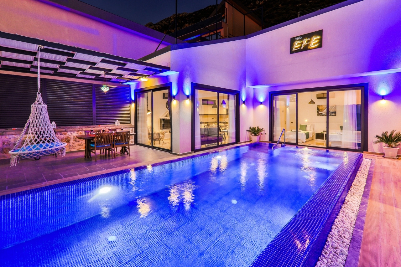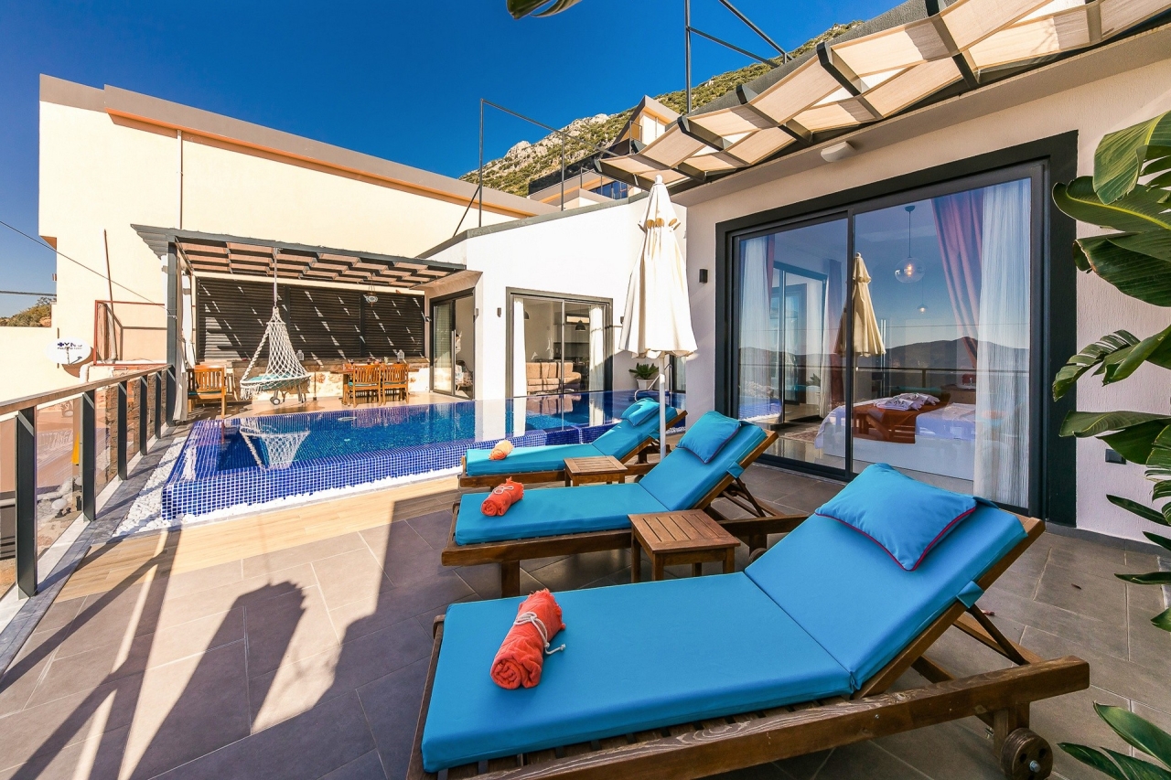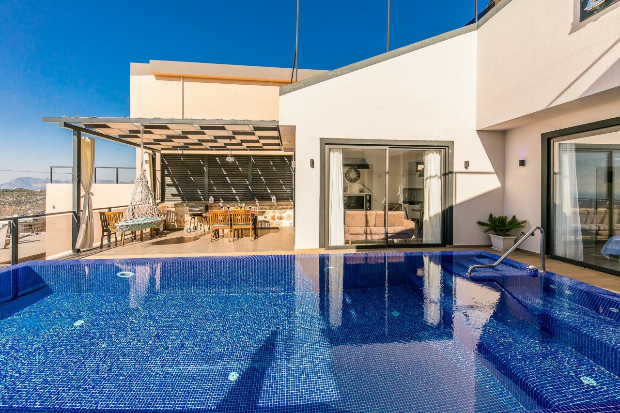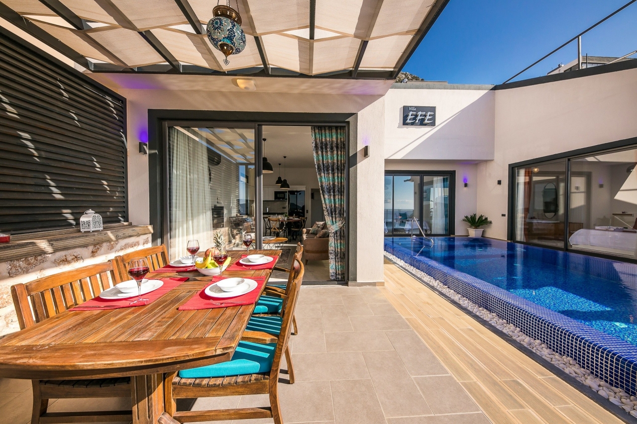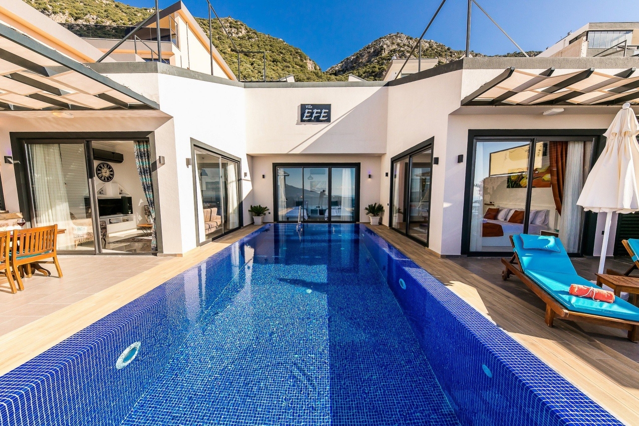 Villa Efe is a private and luxurious retreat located in Kalkan’s Kordere district, thoughtfully designed in a distinctive U-shape that encloses a tranquil pool at its heart. The pool features elegant Roman steps and soothing jacuzzi jets, creating a peaceful spot to unwind. Inside, the villa offers two bedrooms: a double and a twin, making it ideal for small families or couples seeking a quiet escape. The double bedroom is particularly indulgent, complete with its own jacuzzi bath.From Villa Efe, you can enjoy captivating sea views and sunsets, often described as some of the most remarkable in Kalkan. The town centre, with its array of restaurants, shops and beach clubs, is just a 6 to 7-minute drive away. Meanwhile, two supermarkets, Sok and Migros Jet, lie within a comfortable 5 to 6-minute walk.InteriorsThis single-storey villa is cleverly laid out with an open-plan living area and kitchen on one side, while the double bedroom occupies the opposite wing, with the twin bedroom...