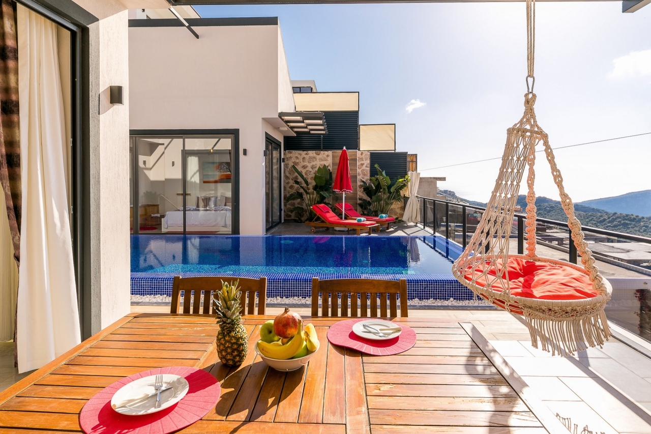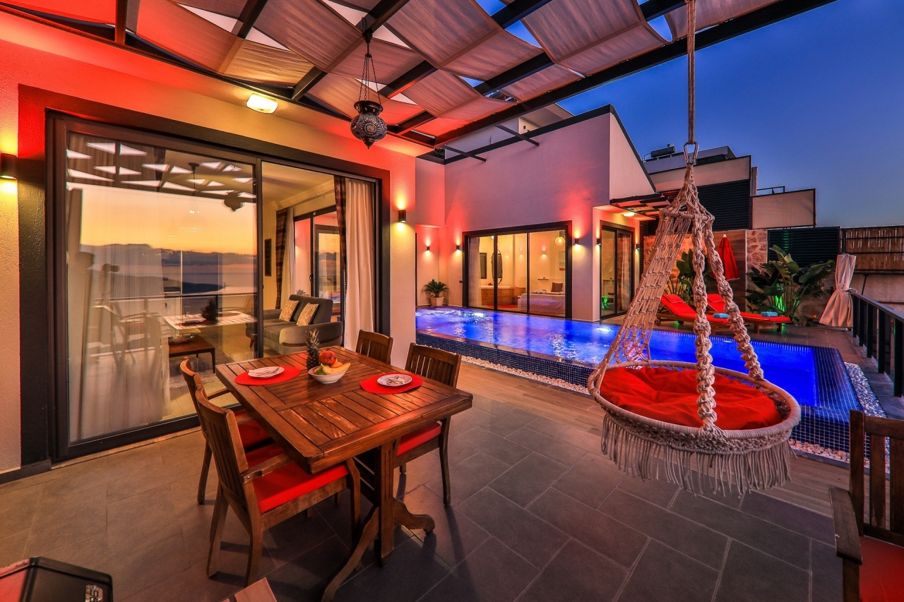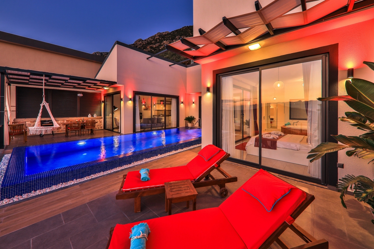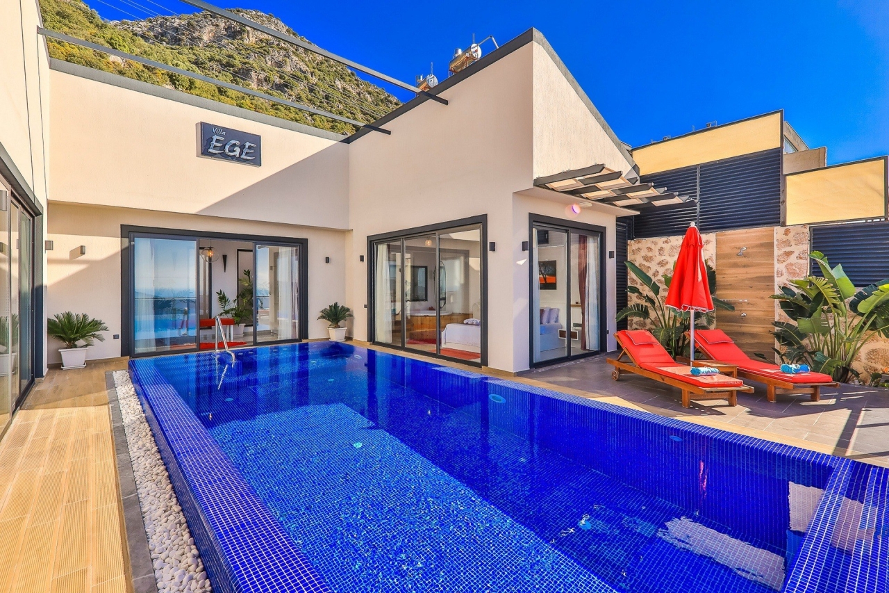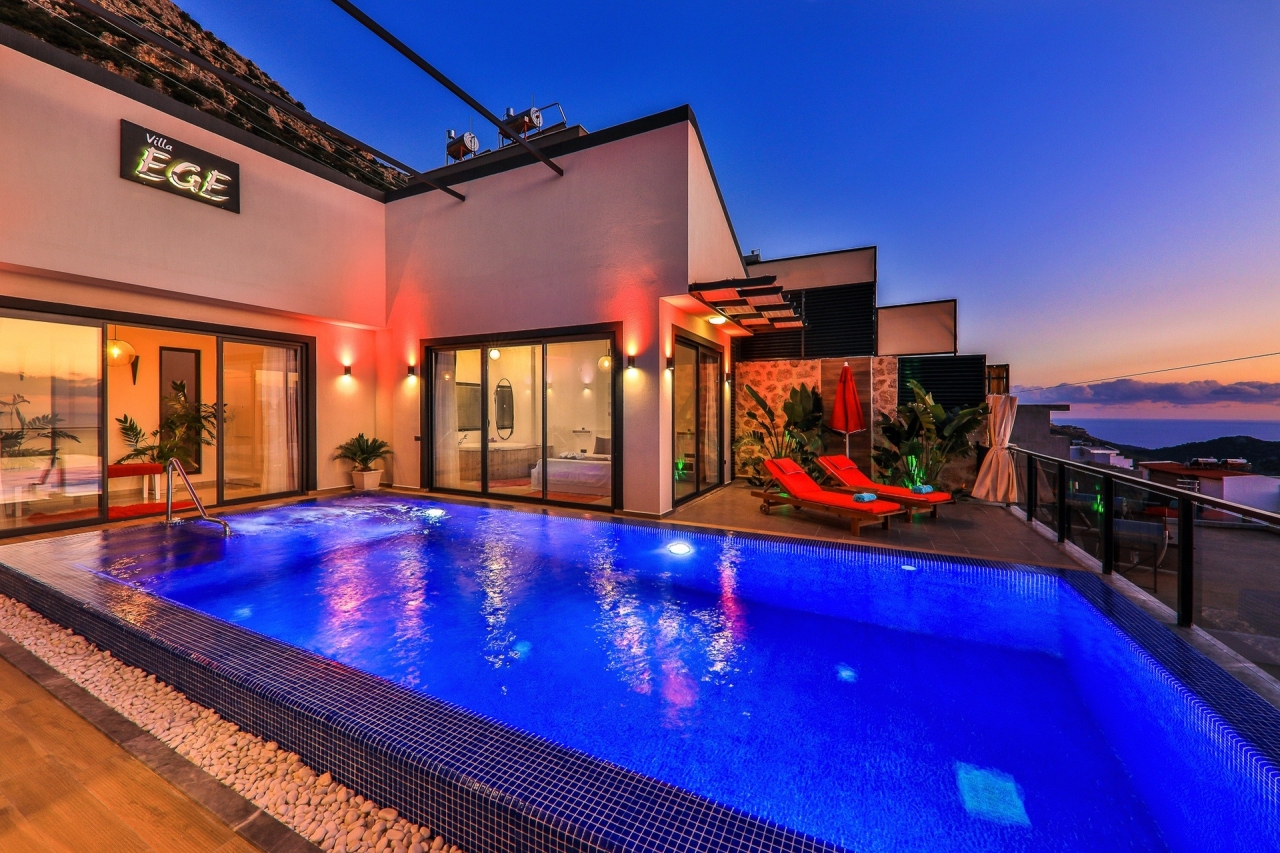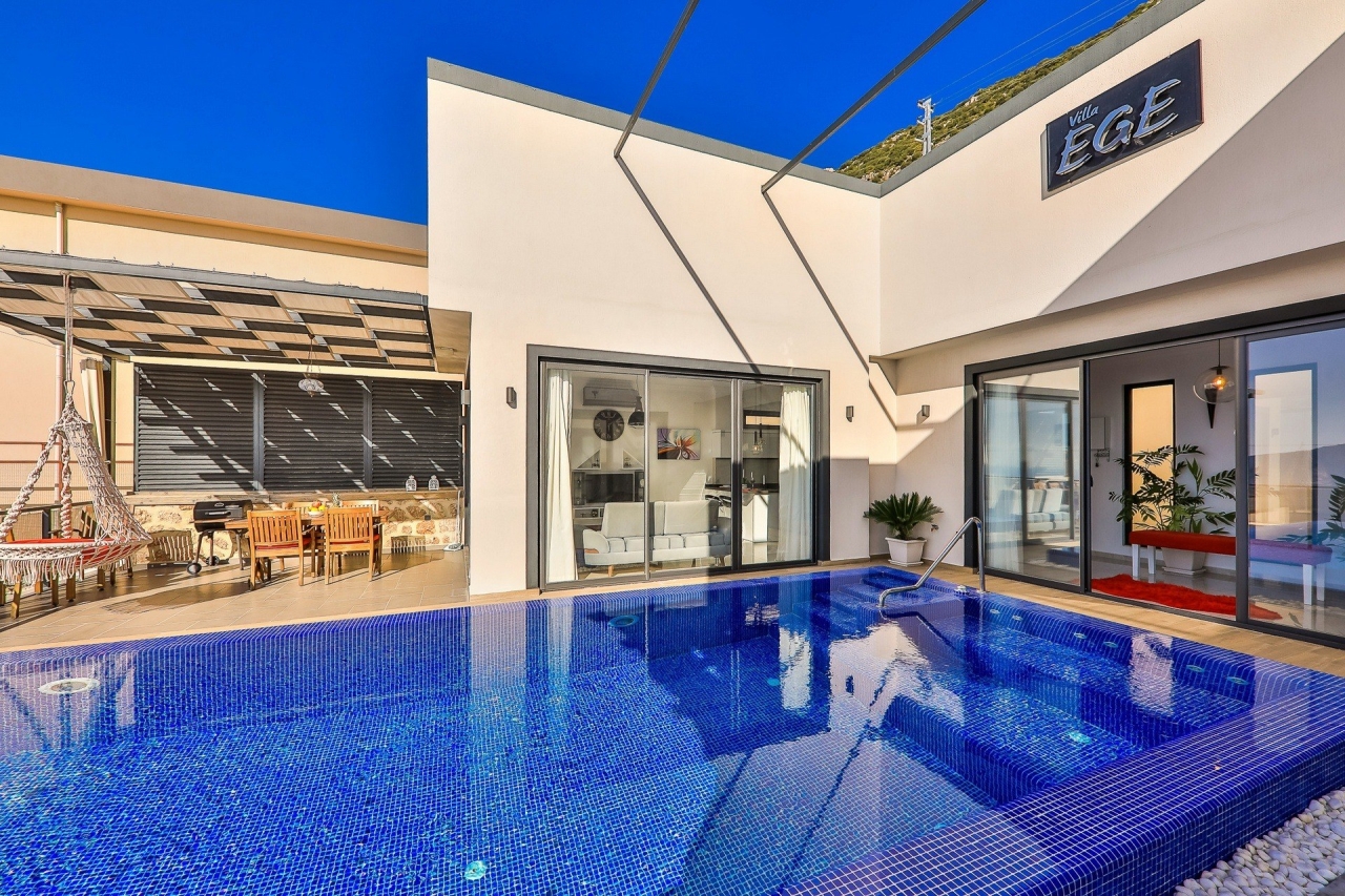 Villa Ege is a stylish and private retreat in Kalkan's Kordere district, thoughtfully designed in a distinctive U-shape with a secluded pool nestled at its heart. The pool features Roman-style steps and soothing jacuzzi jets, inviting you to unwind in utter calm. Inside, a chic bedroom with a double jacuzzi sets the scene for romance—ideal for honeymooners or couples seeking a tranquil escape.From here, the sea views and sunsets are truly captivating, often hailed as some of the finest in Kalkan. Just a short 6 to 7-minute drive brings you to the town centre, where an array of restaurants, shops, and beach clubs awaits. For everyday essentials, two supermarkets—Sok and Migros Jet—are conveniently reachable within a 5 to 6-minute stroll.InteriorsAll on one level, the villa’s layout divides between an open-plan living area and kitchen on one side, with the double bedroom on the other. The living space is modern and spacious, furnished with a comfortable sofa, a wooden coffee...