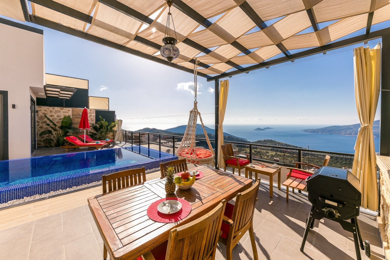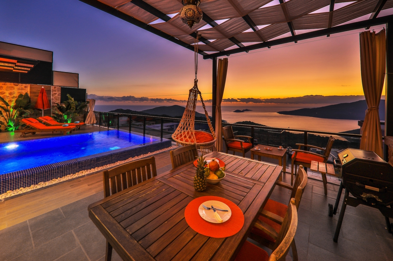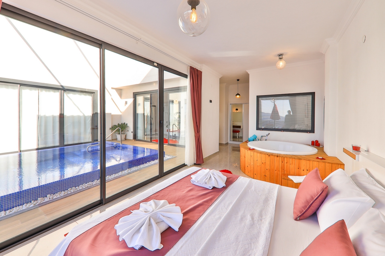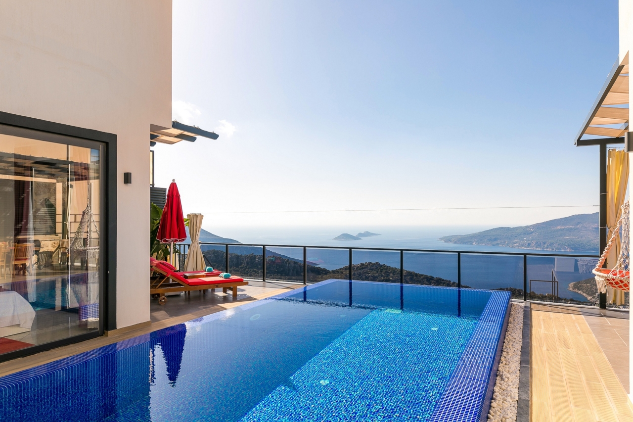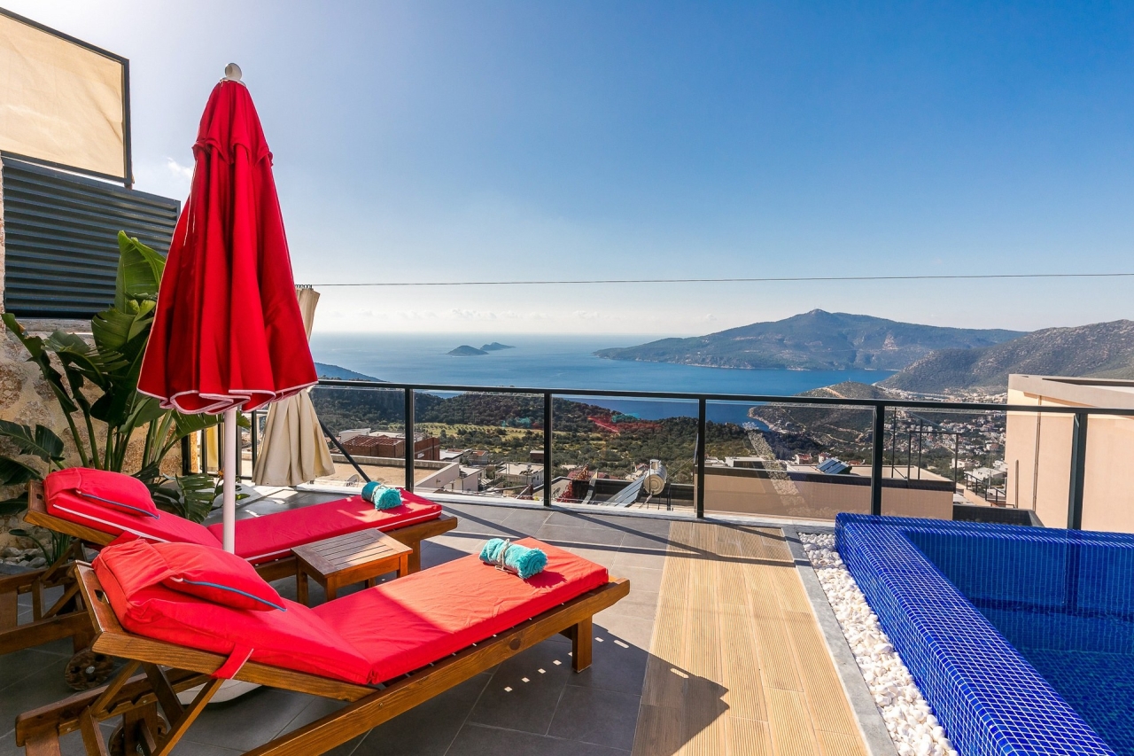 Villa Ege is a stylish and private retreat in Kalkan's Kordere district, thoughtfully designed in a distinctive U-shape with a secluded pool nestled at its heart. The pool features Roman-style steps and soothing jacuzzi jets, inviting you to unwind in utter calm. Inside, a chic bedroom with a double jacuzzi sets the scene for romance—ideal for honeymooners or couples seeking a tranquil escape.From here, the sea views and sunsets are truly captivating, often hailed as some of the finest in Kalkan. Just a short 6 to 7-minute drive brings you to the town centre, where an array of restaurants, shops, and beach clubs awaits. For everyday essentials, two supermarkets—Sok and Migros Jet—are conveniently reachable within a 5 to 6-minute stroll.InteriorsAll on one level, the villa’s layout divides between an open-plan living area and kitchen on one side, with the double bedroom on the other. The living space is modern and spacious, furnished with a comfortable sofa, a wooden coffee...