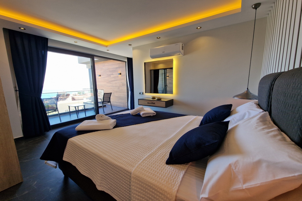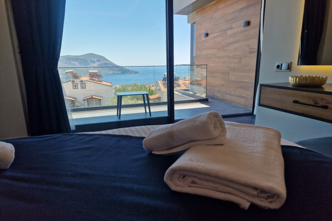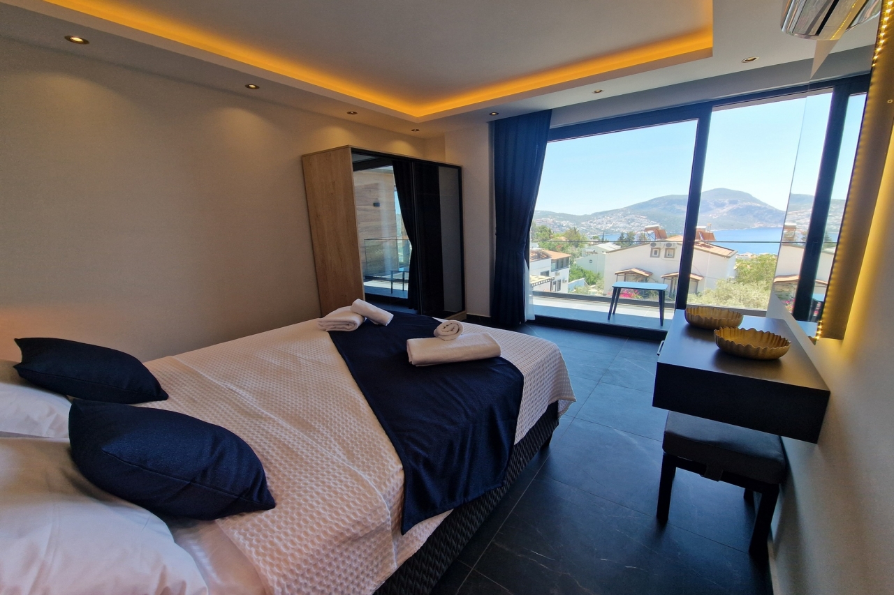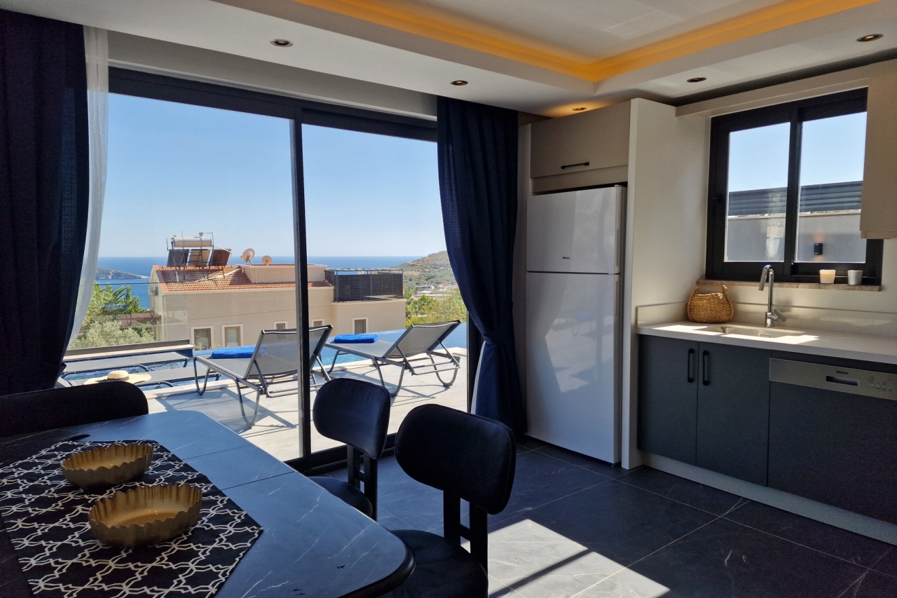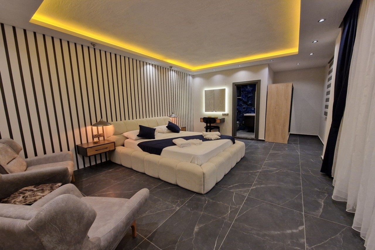 Villa Elite Escape, a fresh arrival for the 2026 season, presents captivating sea views from its first and second floors, inviting you to unwind in serene surroundings. Situated in the sought-after Ortaalan district, the villa is just a leisurely 10 to 12-minute stroll from Kalkan’s bustling town centre, with its charming restaurants, boutique shops and lively bars. For added convenience, the Migros supermarket is easily within reach.This remarkable home features two pools—an outdoor L-shaped swimming pool on the terrace and a heated indoor pool below—alongside a sauna, a cosy cinema room, and a table football setup that promises lighthearted competition. Descend to the lower ground floor where a kitchen bar with three stools sits ready for casual drinks. A mini fridge and sink with an array of glassware are thoughtfully arranged above, while a washing machine is tucked beneath the stairs. This level also hosts a spacious double bedroom with an en-suite shower room. Sliding...
