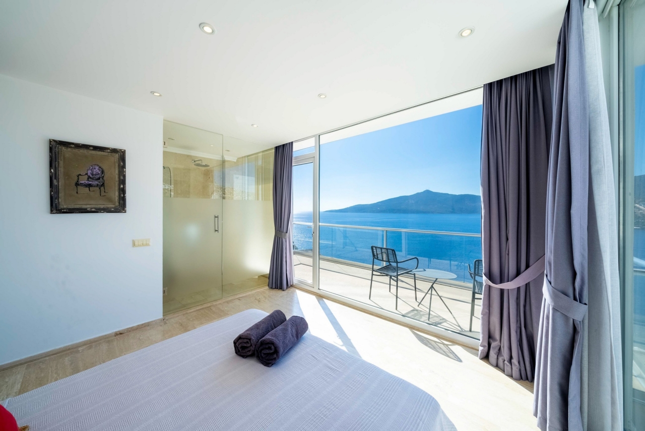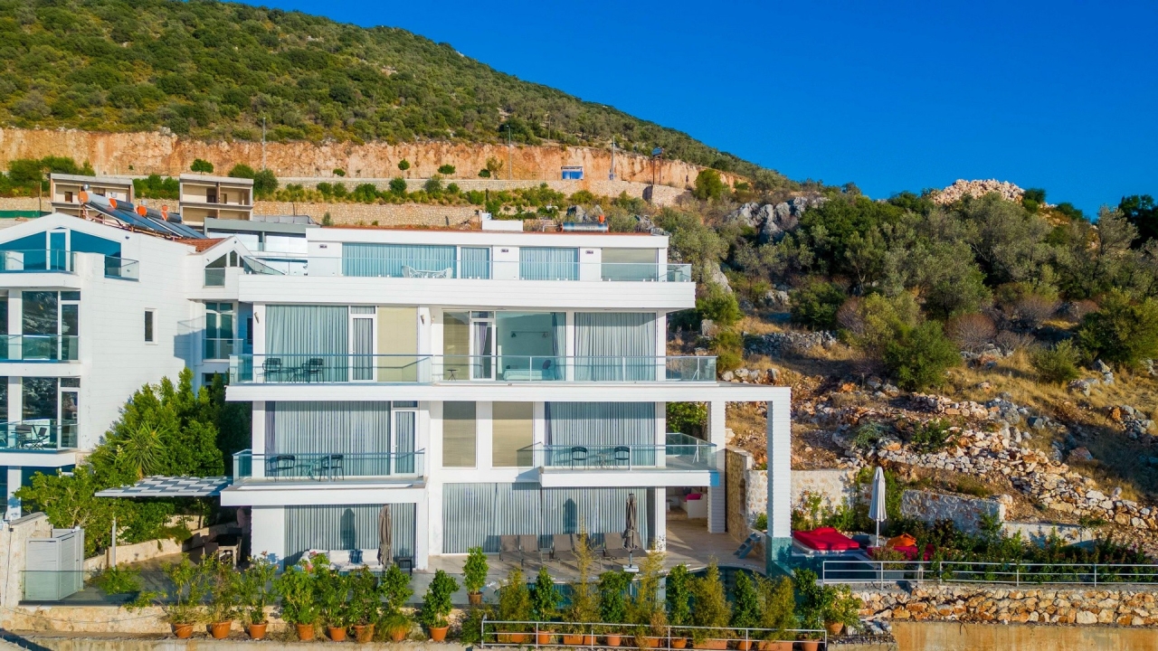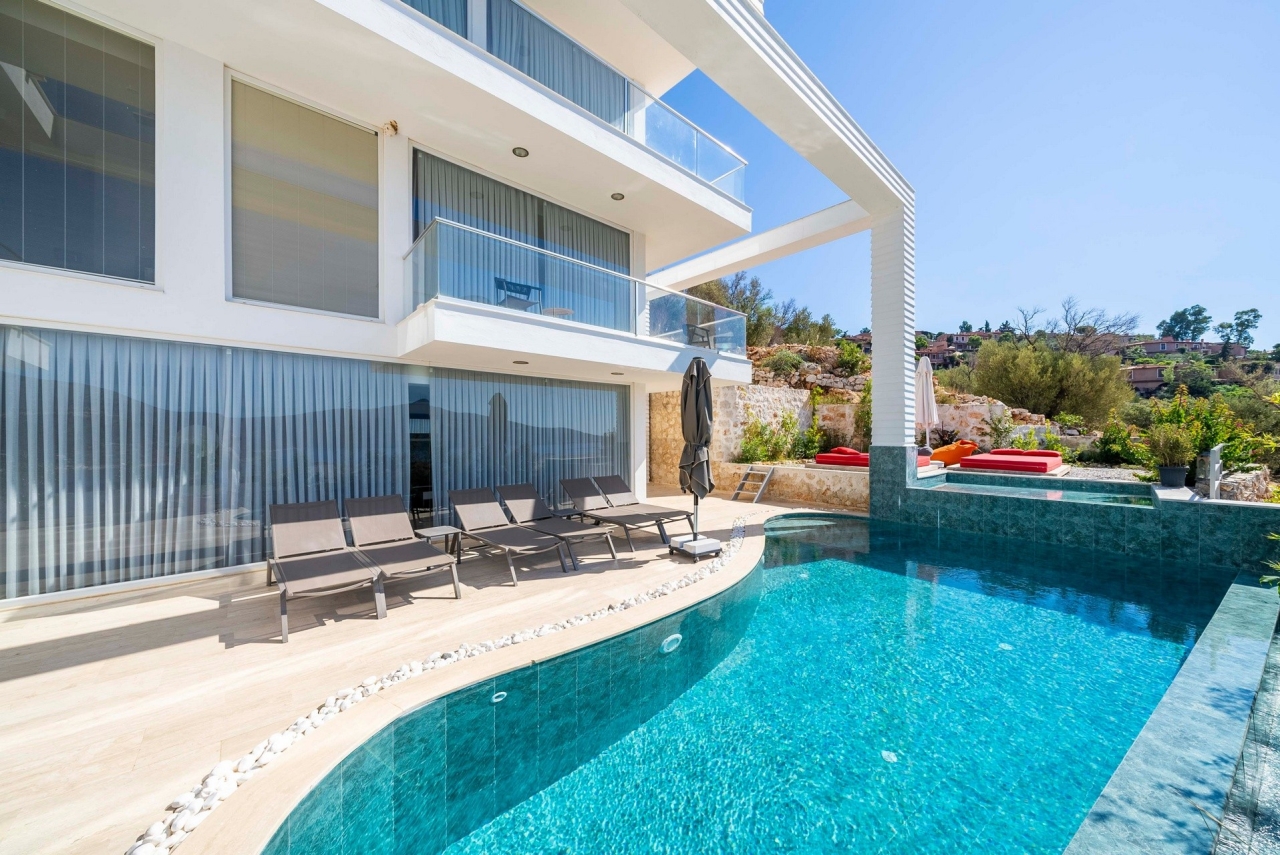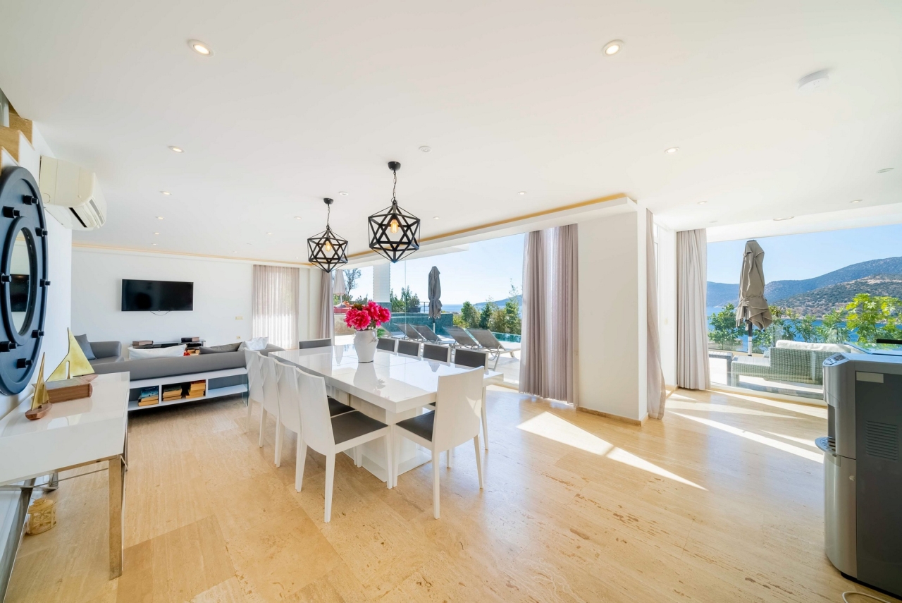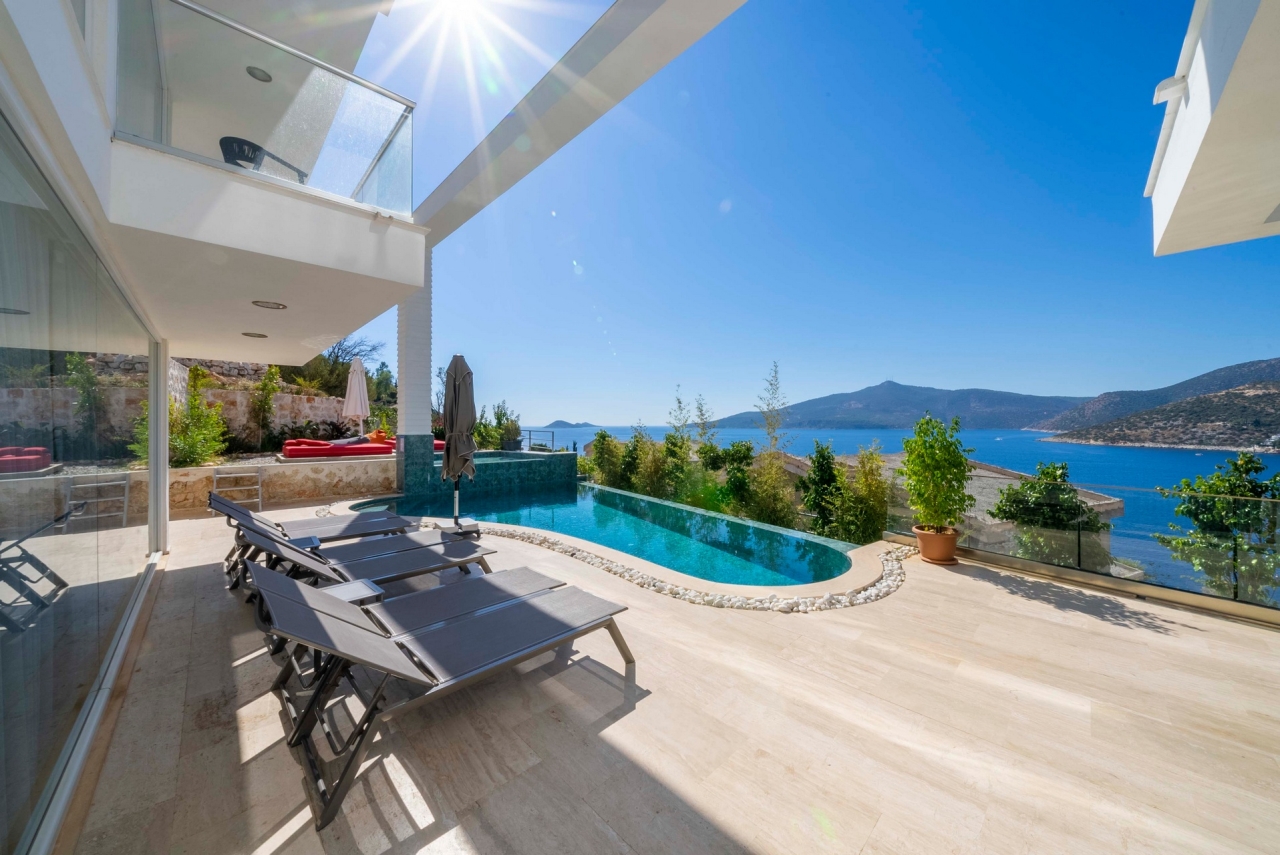 Villa Lumineux Kalkan is a spacious villa in the prestigious Komurluk area of Kalkan and hosts up to 12 guests with six en-suite bedrooms. Set on the hills just above the sea, the property offers captive views of the dazzling turquoise bay and harbour, and this area of Kalkan has the advantage of the latest evening sun and spectacular sunsets. A wrap-around pool terrace provides you with everything you need to savour your time in the sun, including a curved infinity pool, ample sun loungers, and pergola shaded dining area. There is even an authentic Turkish-style corner seating area, perfect for reclining with a book in the shade.The sleek interior covers three floors with tastefully arranged contemporary rooms which feel light and spacious. At the ground floor level, a sizeable living area with a modernised kitchen containing high-quality appliances and a breakfast bar integrated into a large kitchen island. A total of 6 bedrooms occupy this villa, each with sleek glass-fronted...