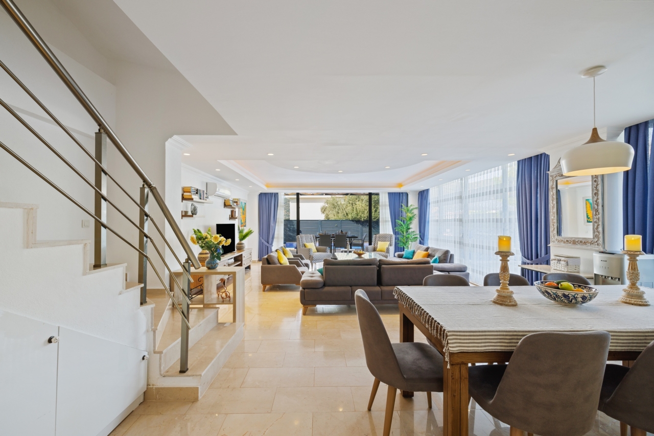 We are delighted to present Villa Marina, a distinguished 4-bedroom holiday property newly introduced to our portfolio for the 2026 season.Positioned just off Kalamar Road, this generously proportioned villa enjoys charming views over the neighbouring mountains and olive groves. Finished in a contemporary style, the property sits on a relatively level road, making the stroll to the town centre a straightforward 15 to 20 minutes. A variety of local conveniences, such as the CarrefourSa supermarket, Cafe Vita, The Kitchen by Korsan, and Aqua Cafe, lie close at hand. Moreover, a pathway through the adjacent olive grove provides direct access to the seafront.Ground FloorThe front door opens into a hallway that includes a cloakroom/W.C. with a shower. A washing machine is discreetly tucked away in a cupboard beneath the stairs for guests’ convenience.The spacious open-plan living area is furnished with two sizeable sofas and four armchairs arranged around a coffee table, alongside a...