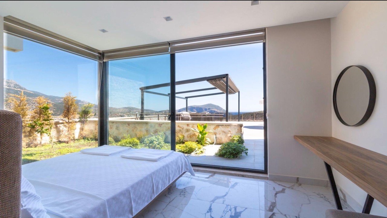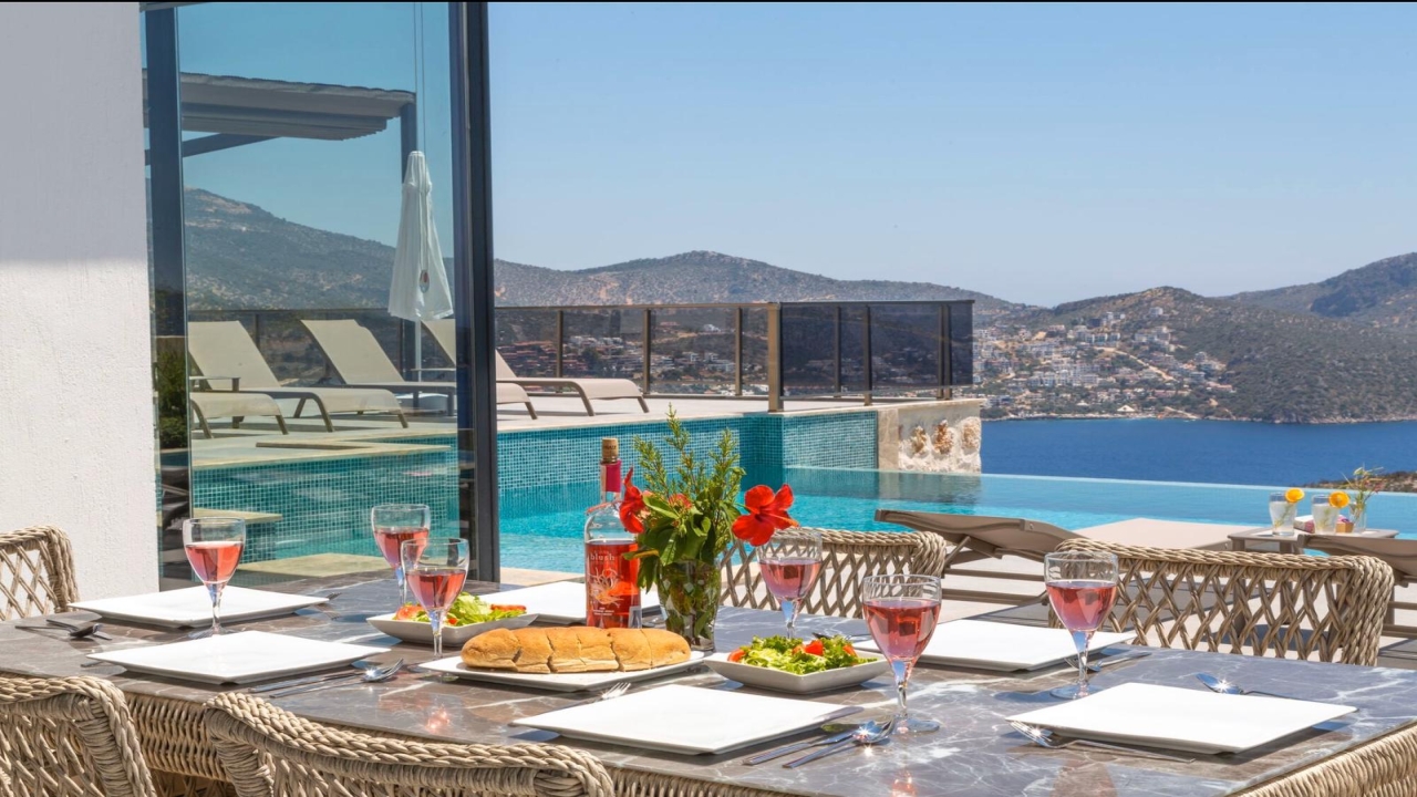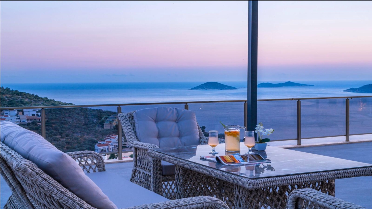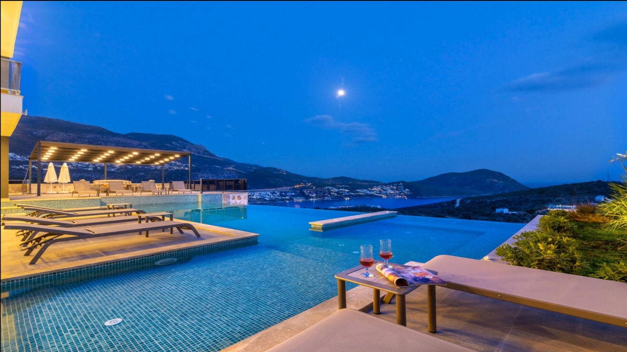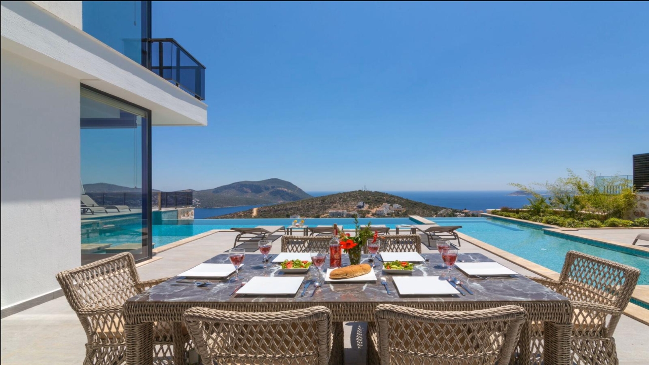 Villa Mirada 1 Kalkan is in the Kalamar area and has five deluxe bedrooms to sleep up to 10 guests. The contemporary villa has a beautifully maintained terrace with a wrap-around infinity pool that combines a children’s paddling pool and a jacuzzi. Modern in design, spaciously planned, and plentiful in amenities, villa Mirada 1 has much to offer our guests. Striking views of the sea and mountains can be enjoyed from both the pool terrace and the interior of this gorgeous 5-bedroom villa. Stunning views of the sea and islands can be seen throughout the villa.The villa’s ground floor has an elegant living room finished with stylish furnishings and marble flooring. An American-style fitted kitchen connects to this room, with plenty of appliances, including a built-in oven and microwave, dishwasher, and fridge freezer. When you want relief from the midday sun, an indoor dining table is featured in the kitchen, overlooking the pool and sea views. This glass-fronted living space opens...