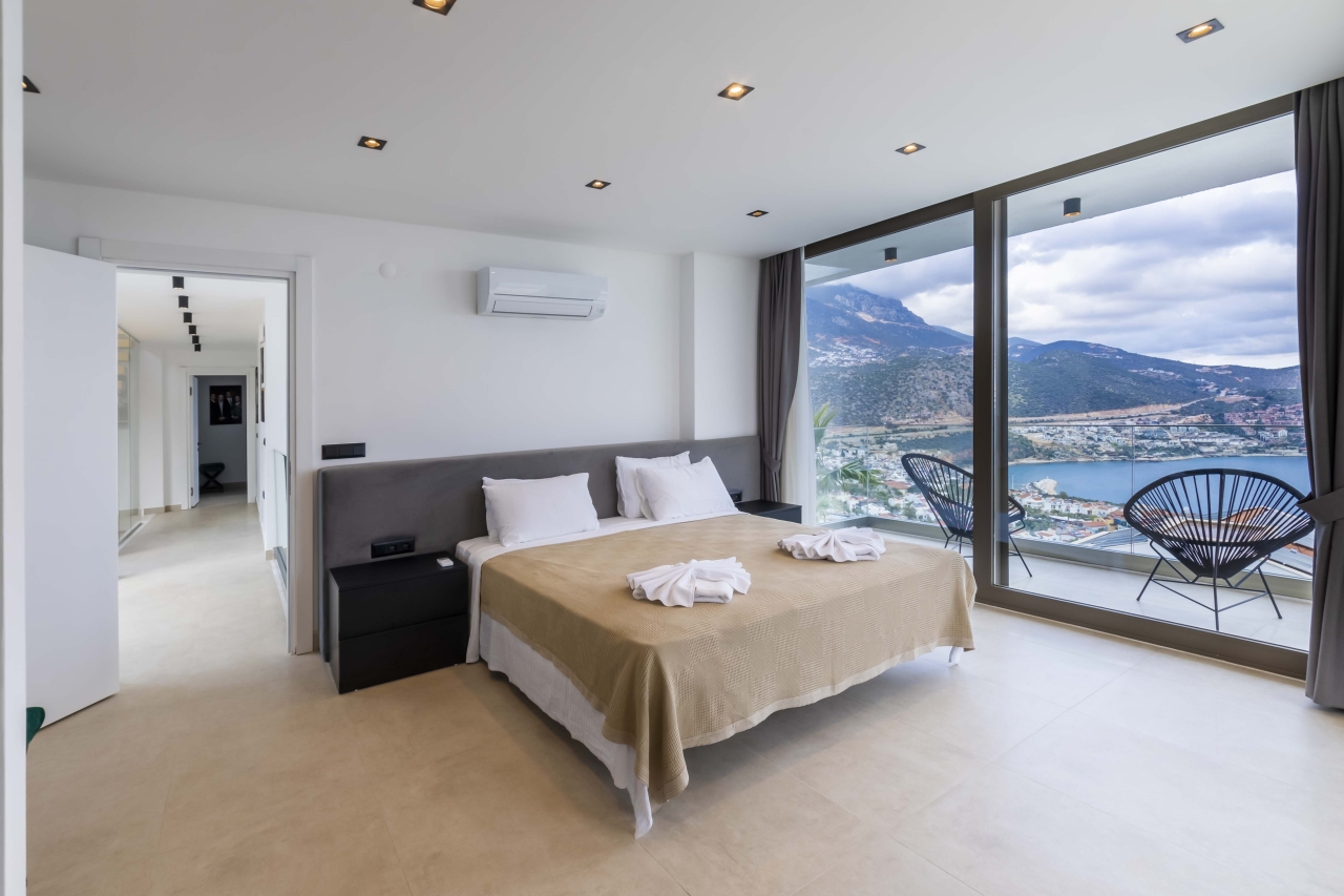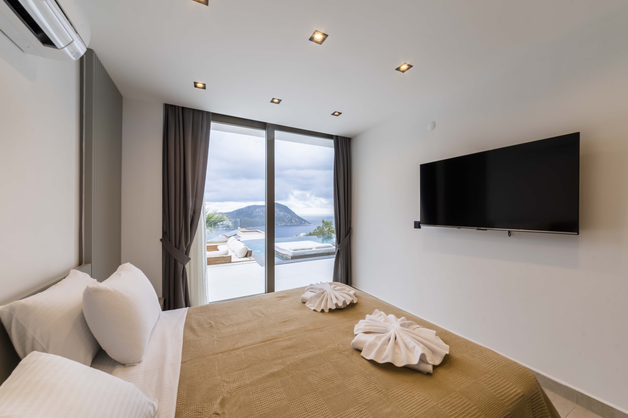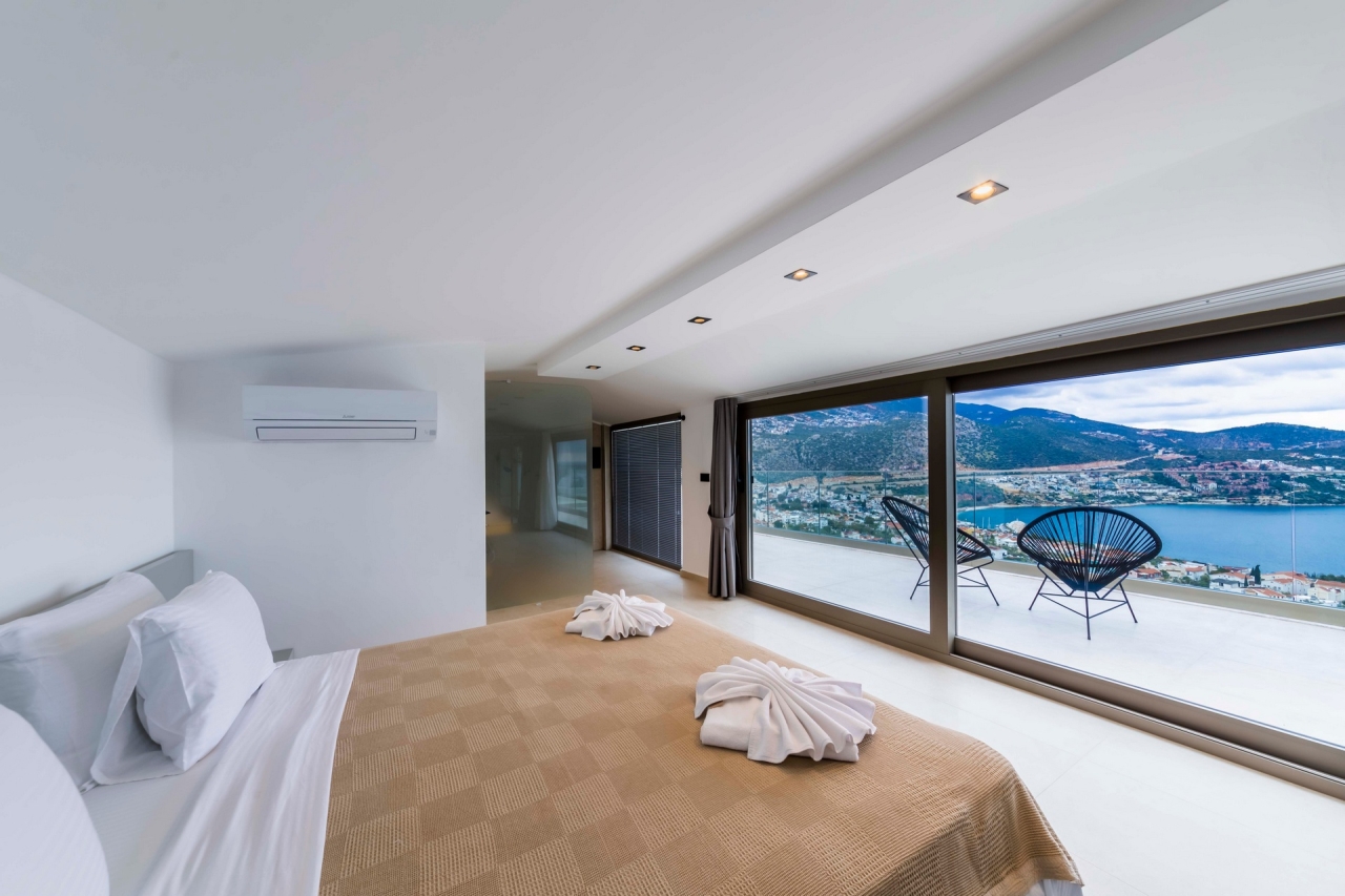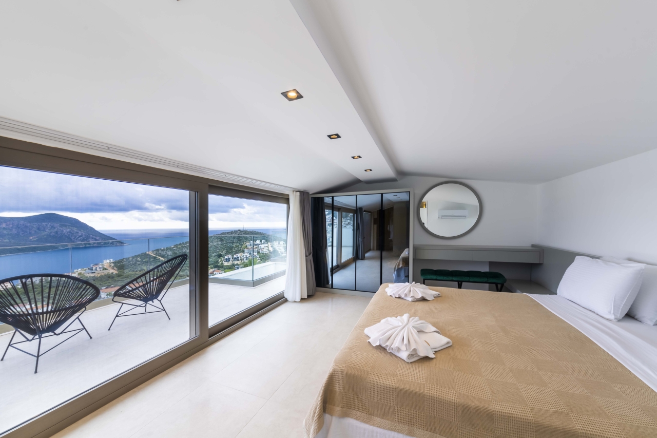 The master bedroom, Bedroom 4, is a double room situated beyond the mezzanine. It features a freestanding bathtub and is separated from an adjoining shower room—complete with WC and twin basins—by black-tinted glass. The room also includes bedside tables, a vanity table, a wall-mounted TV, and a dressing area with wardrobes. Glass sliding doors open to a side balcony furnished with two chairs and a small table, perfect for enjoying views over Kalkan and Kalamar Bays.