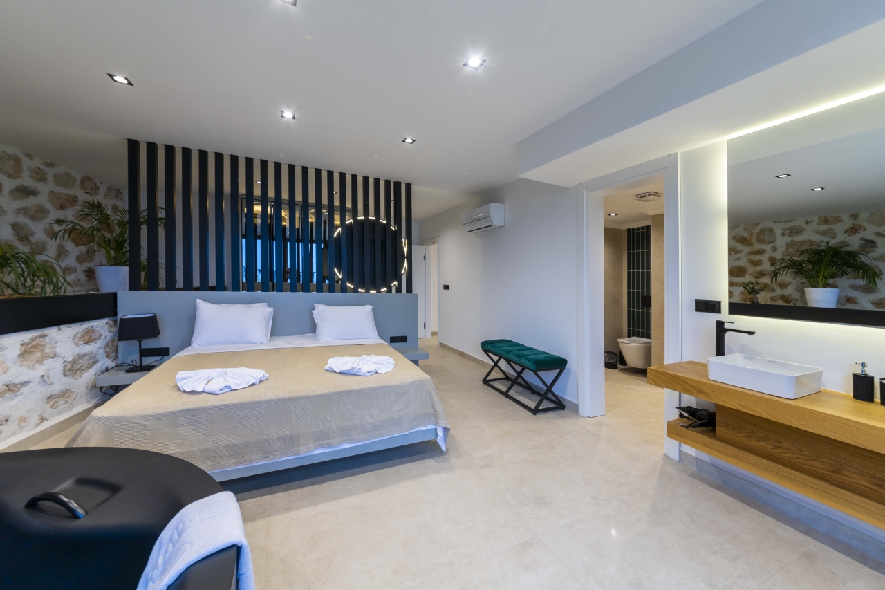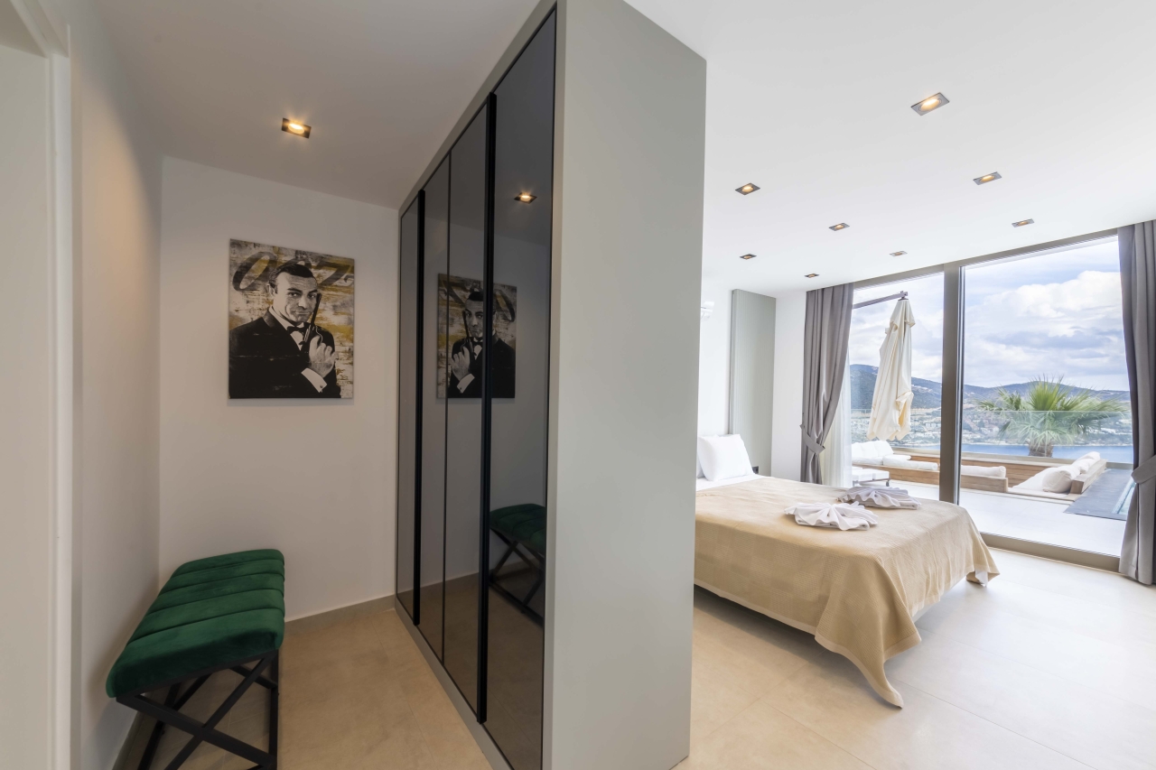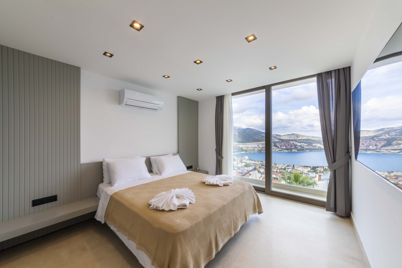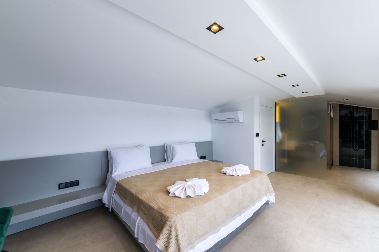 The master bedroom, Bedroom 4, is a double room situated beyond the mezzanine. It features a freestanding bathtub and is separated from an adjoining shower room—complete with WC and twin basins—by black-tinted glass. The room also includes bedside tables, a vanity table, a wall-mounted TV, and a dressing area with wardrobes. Glass sliding doors open to a side balcony furnished with two chairs and a small table, perfect for enjoying views over Kalkan and Kalamar Bays.