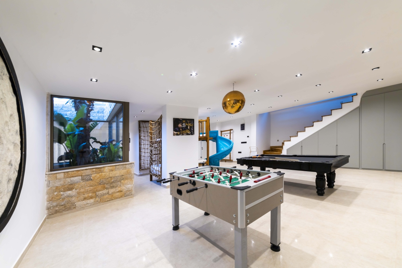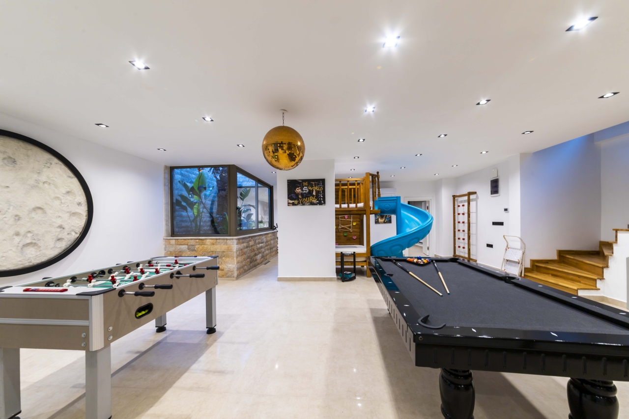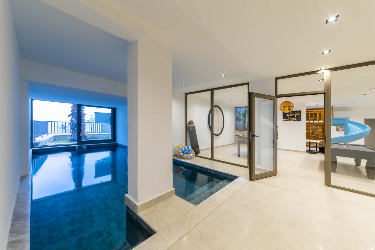 The villa benefits from two private swimming pools — one indoor and one outdoor — both of which can be heated on request for an additional charge. The outdoor pool extends to 15 metres and includes a jacuzzi section, sunbathing platforms, and a shallow zone that’s ideal for children. Entertainment is well catered for with a cinema room, games room, gym equipment, sauna, and hammam, making it an excellent choice for families or groups seeking both relaxation and activity.