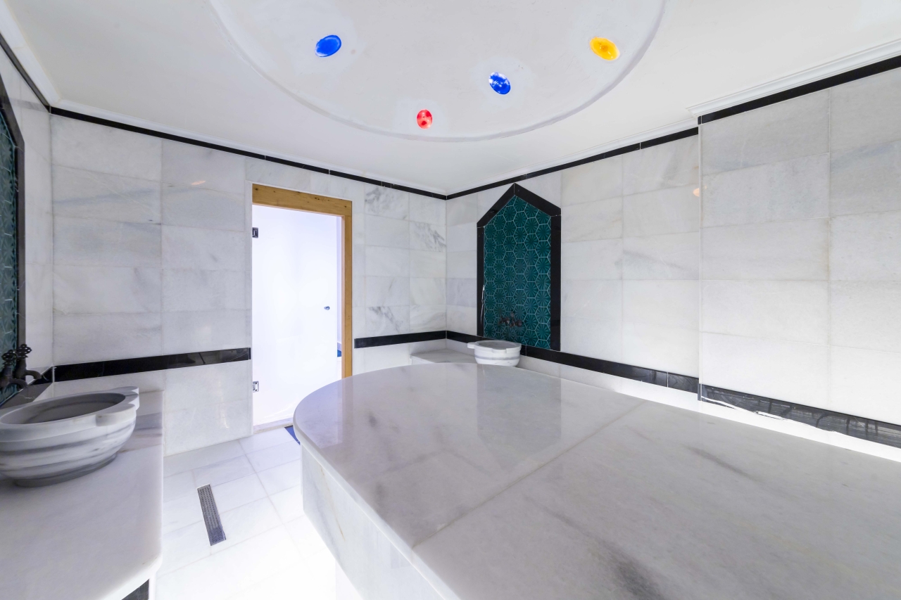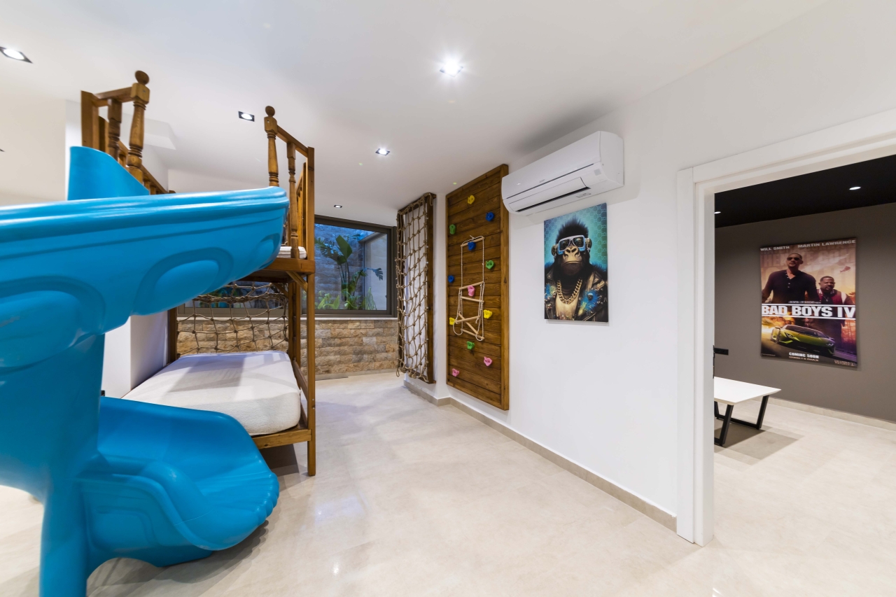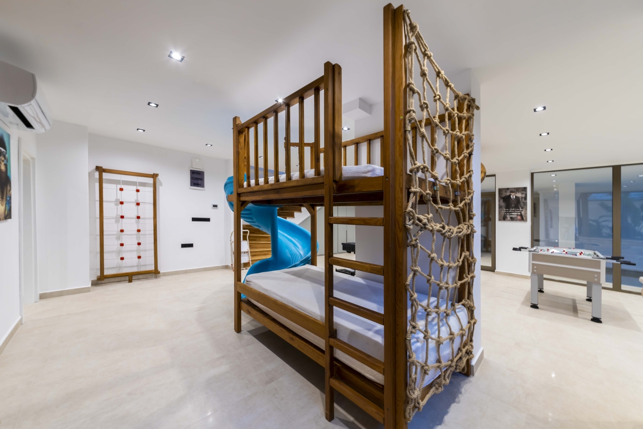 The villa benefits from two private swimming pools — one indoor and one outdoor — both of which can be heated on request for an additional charge. The outdoor pool extends to 15 metres and includes a jacuzzi section, sunbathing platforms, and a shallow zone that’s ideal for children. Entertainment is well catered for with a cinema room, games room, gym equipment, sauna, and hammam, making it an excellent choice for families or groups seeking both relaxation and activity.