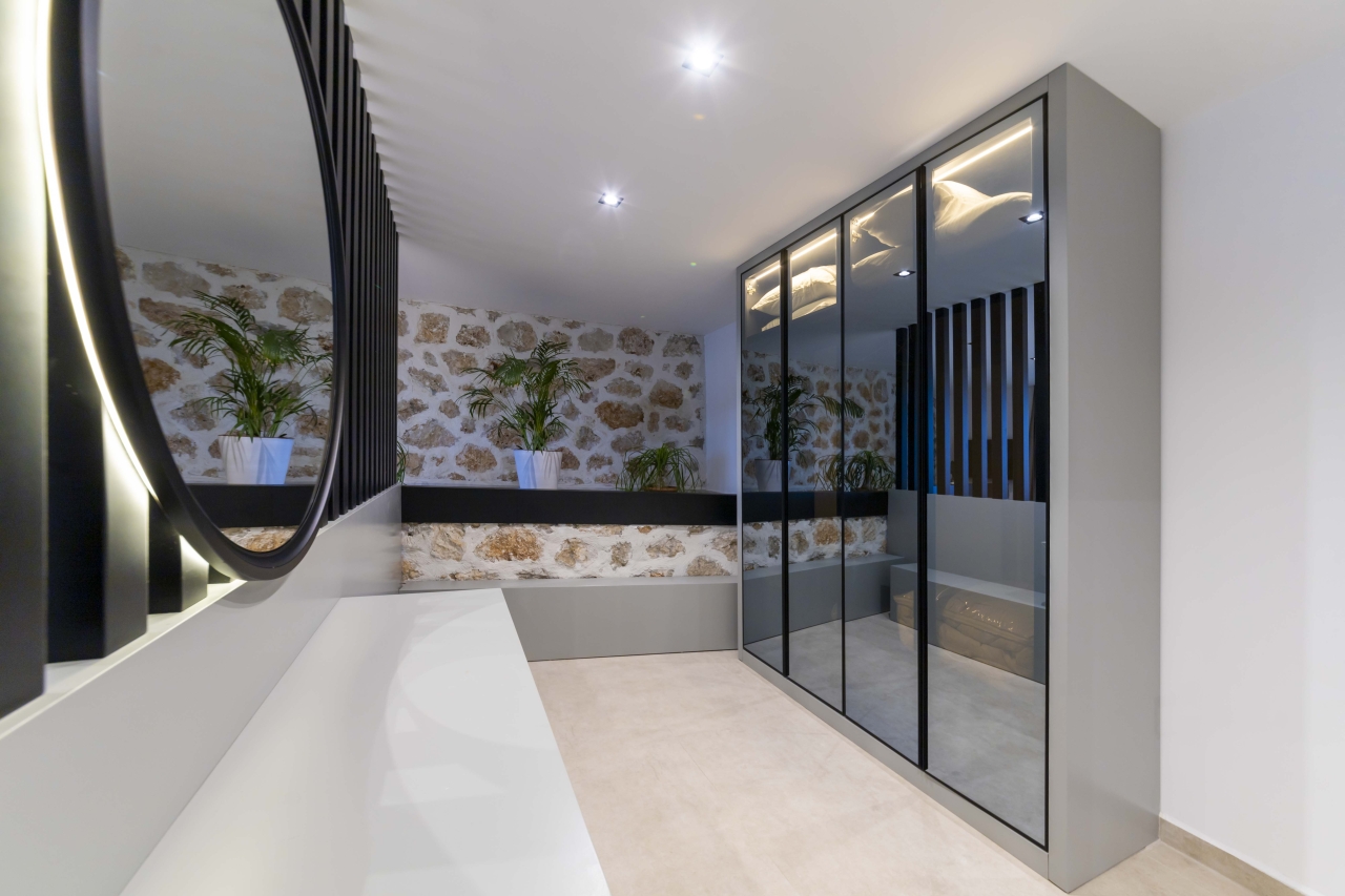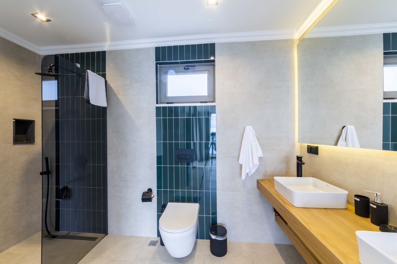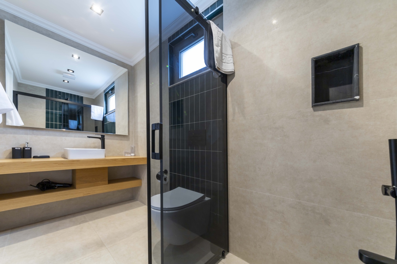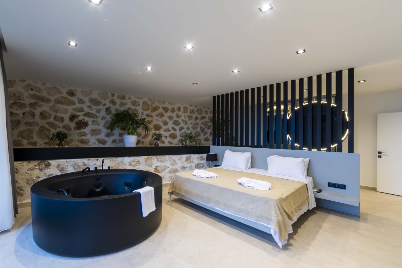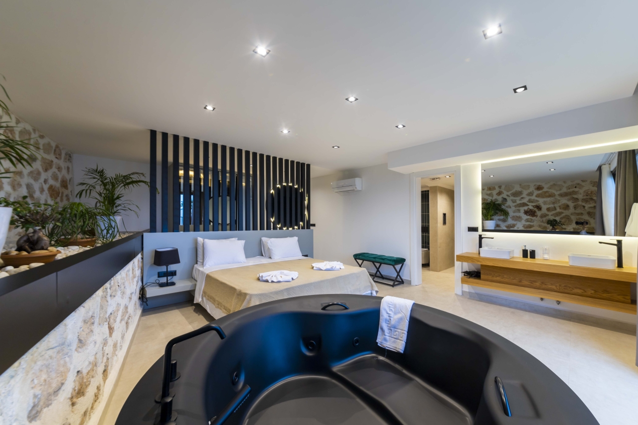Bedroom 6 is on this floor as well. This double room offers an ‘in-room’ black round jacuzzi bath, twin basins, a separate shower area, and a WC. It comes complete with bedside tables, a dressing area with vanity table, wall-mounted TV, and fitted wardrobes. Sliding glass doors open onto the garden patio, which also commands sea views.