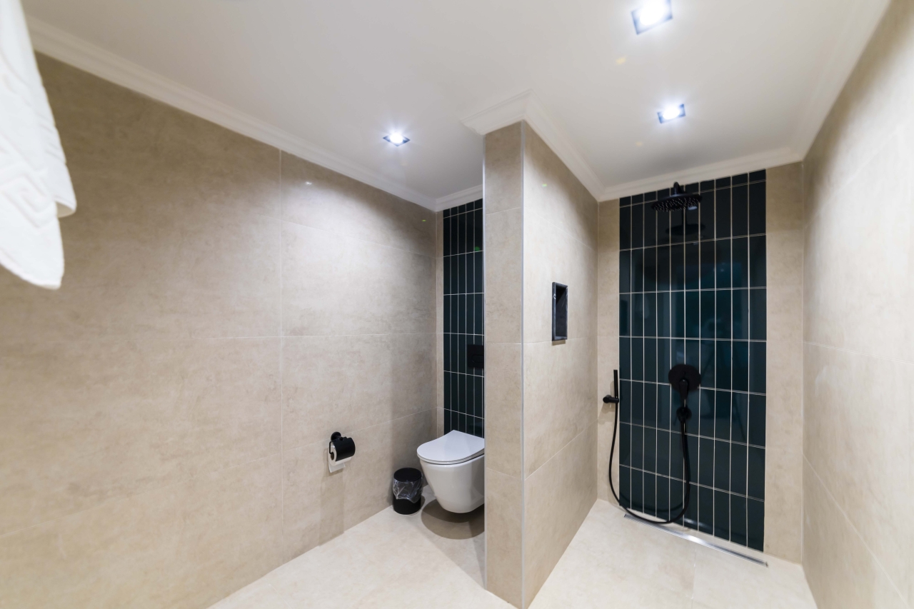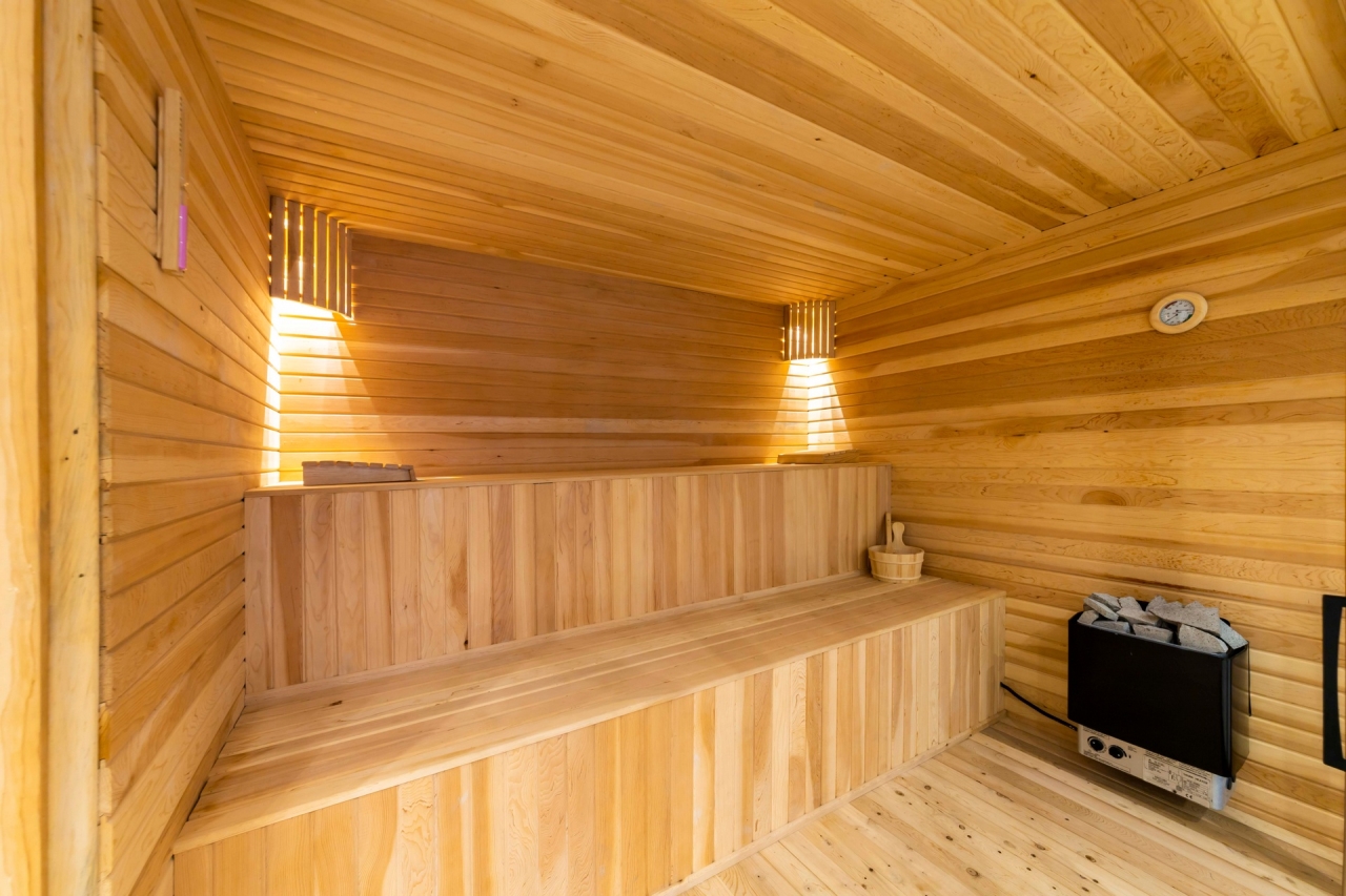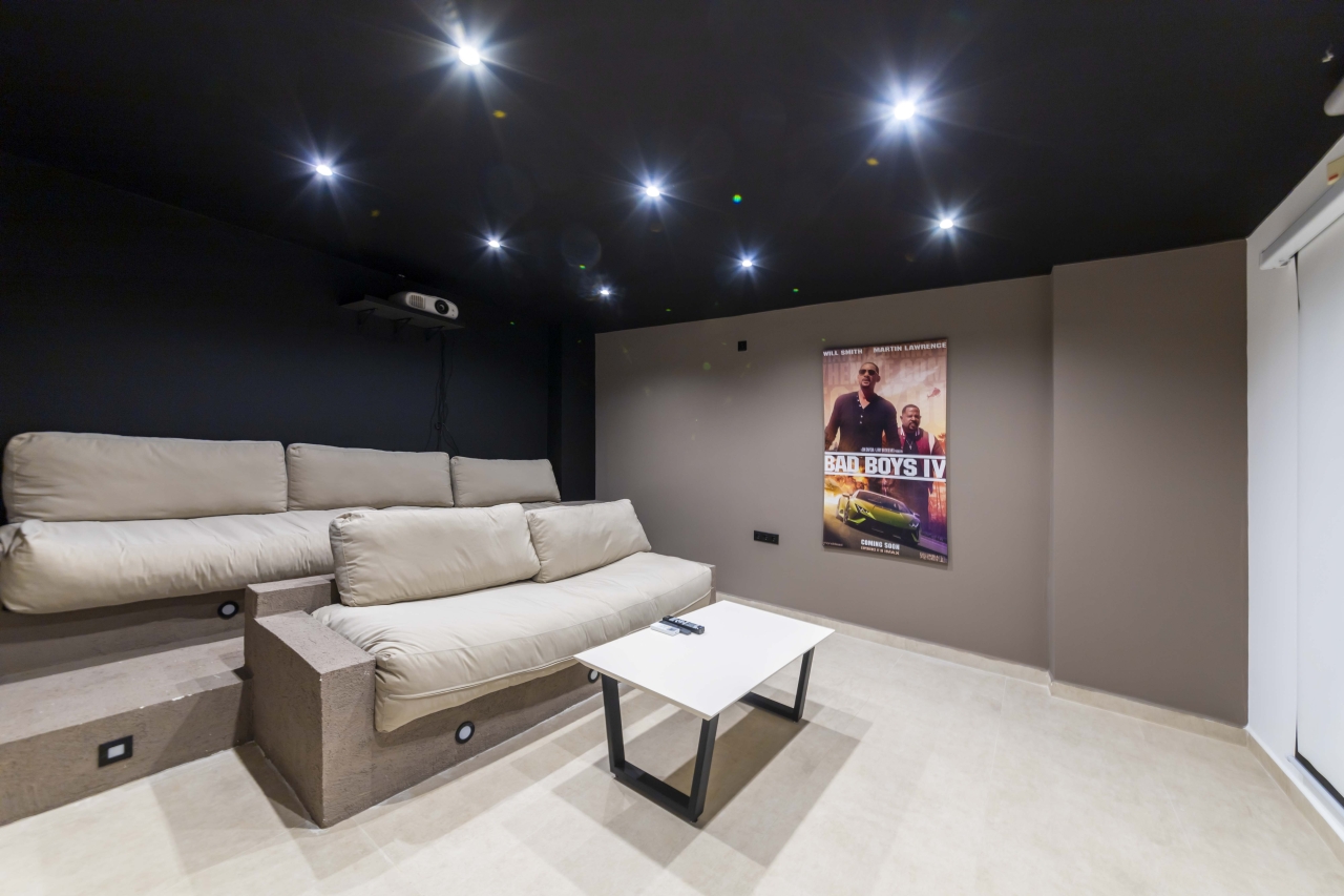 Descending to the lower ground floor, you’ll find a host of leisure options. A washing machine, iron, and ironing board are stored in cupboards beneath the stairs. The games room includes a pool table and table football, while the gym area is equipped with a weight machine, treadmill, exercise bike, aerobic steps, and free weights. This level also houses a sauna, hammam, and a cinema room with comfortable seating.