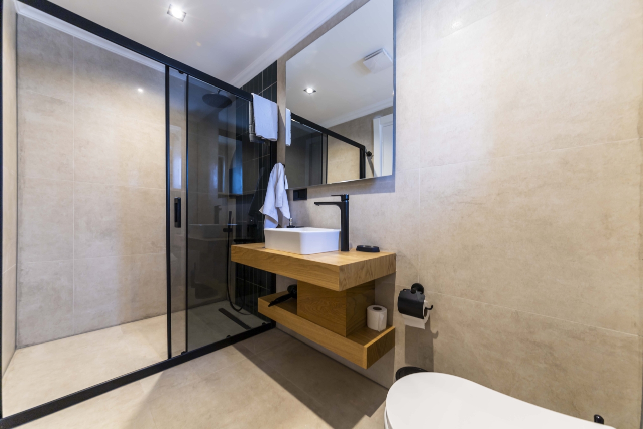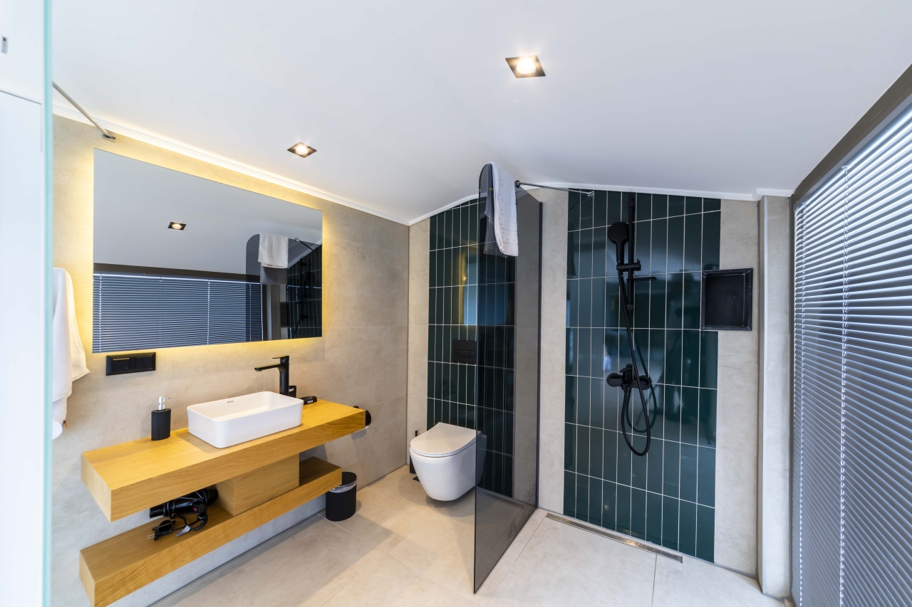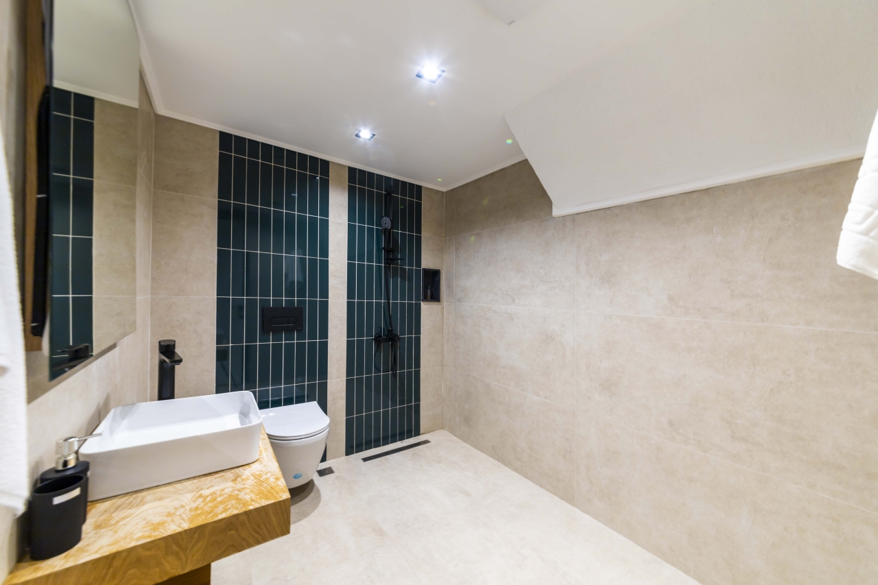 At the top of the stairs, a glass door leads to the roof terrace, which offers a seating area and bar, ideal for socialising or simply taking in the panoramic vistas. The fifth bedroom is also on this floor, with sliding doors opening onto the roof terrace. This double room features an opaque glass wall divider, WC, basin, and a wet-room style shower, along with bedside tables, a vanity table, and wardrobes.