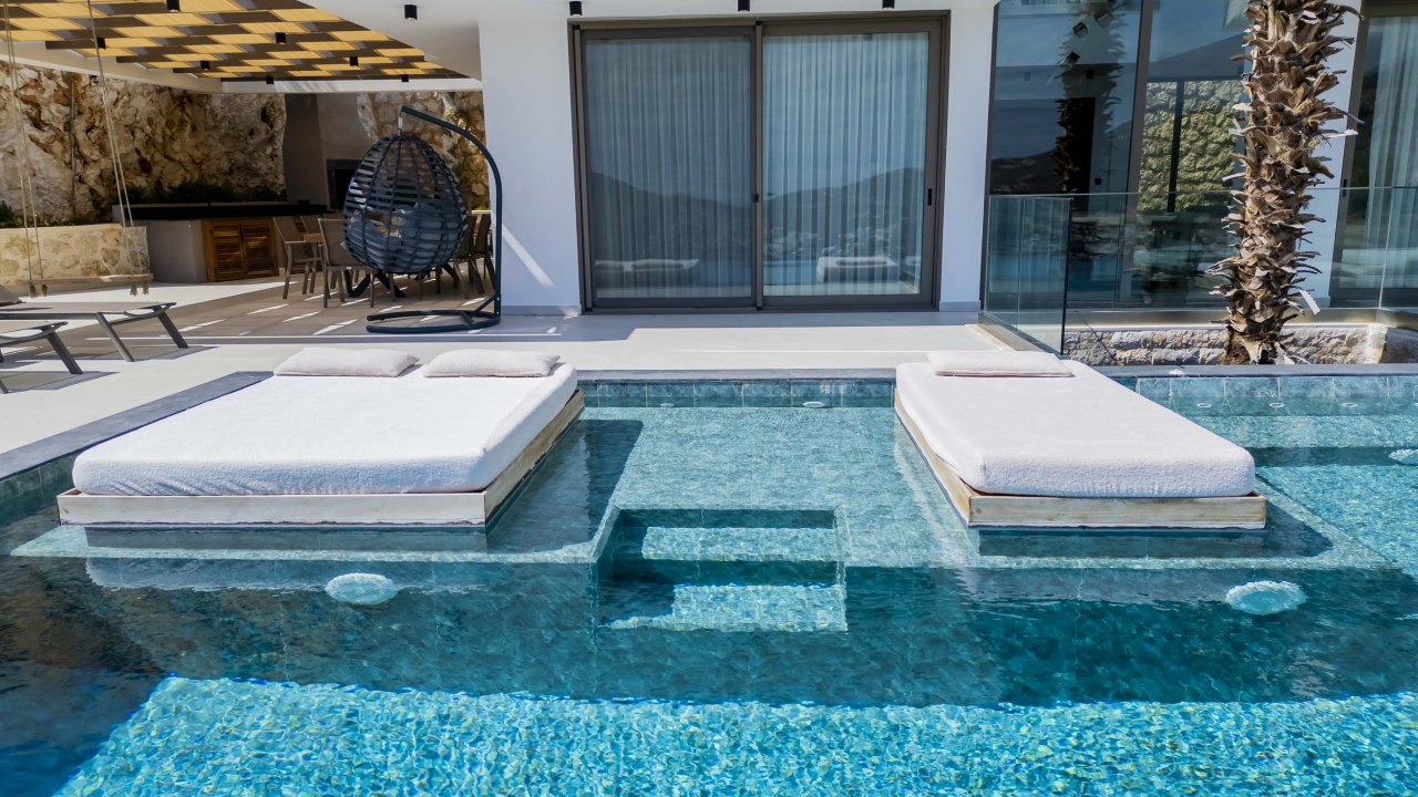 The striking 15-metre infinity pool includes a shallow section with four daybeds set on wooden platforms and steps descending into the water. Around the pool, you’ll find six sun loungers, side tables, two large parasols at one end, and a cosy swing seat. A sunken wooden seating area with cushions and a large cantilevered parasol provides both shade and a vantage point for taking in the surroundings.