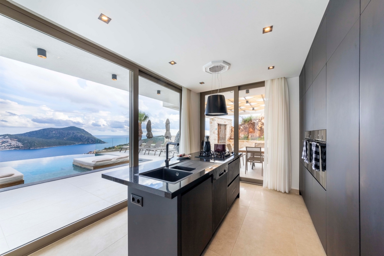The dining area seats twelve guests comfortably and sits beside a stylish black kitchen featuring a central island. This island is equipped with a sink, a five-ring gas hob, a suspended extractor fan, and a dishwasher. The touch-open cupboards conceal a coffee machine, toaster, kettle, sandwich toaster, and blender, while there are also two Bosch ovens—one doubling as a microwave—and a large fridge freezer. The living space includes a generous L-shaped sofa, a coffee table, and a wall-mounted Smart TV. Sliding doors open onto the pool terrace, revealing panoramic sea views.