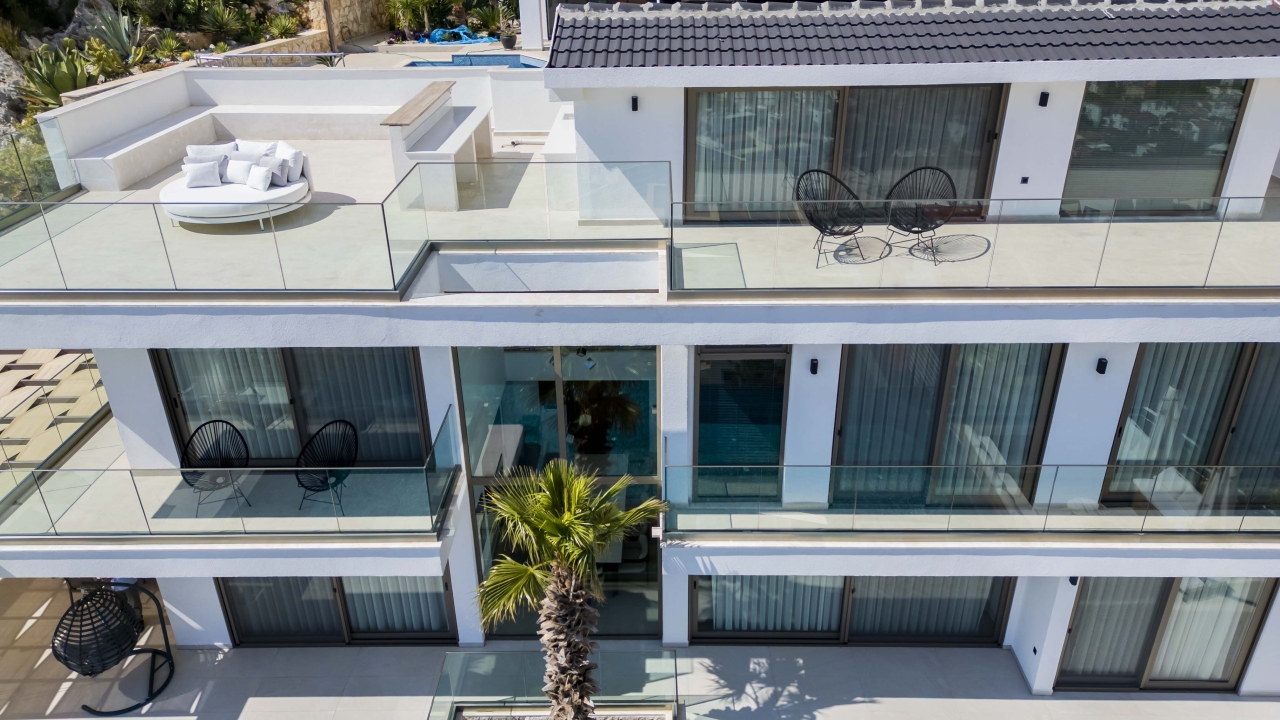 Three more bedrooms are located on this floor. Bedroom 2 is a double with an en-suite shower room, bedside tables, a vanity table, a wall-mounted TV, and a dressing area with wardrobes. Its sliding glass doors open onto a Juliette balcony overlooking the sea.