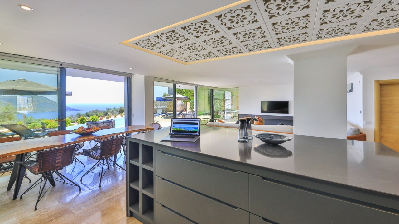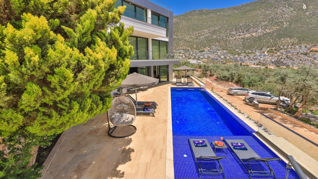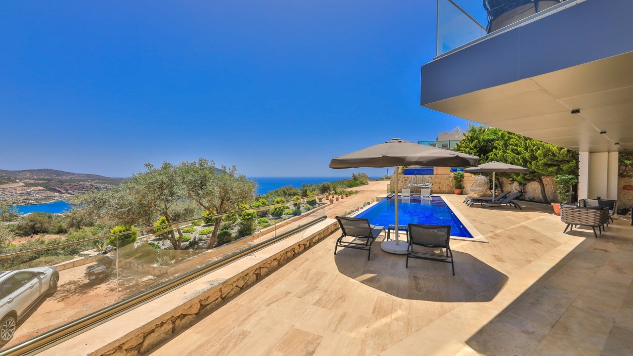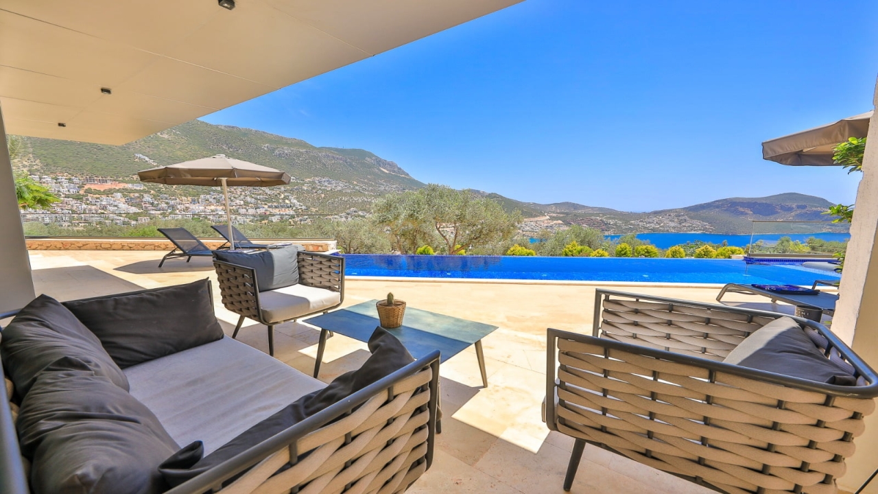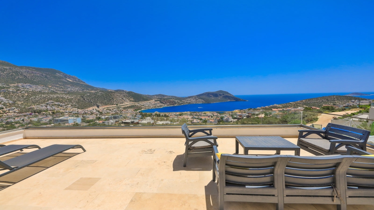 With elevated views of Kalkan Bay and the nearby mountains, Villa Panorama 1 Kalkan in the central Ortaalan area is a large, modern 5-bedroom villa that will excite your senses. Thanks to its well-designed outside terrace, infinity pool, and outdoor eating area, your leisurely summer break will be filled with luxurious relaxation. The property includes an expansive roof patio, generous en suite bedrooms, modern furniture, and breathtaking sea views. A 10-minute downhill stroll will bring you to Kalkan High Street, home to many fantastic amenities.The interior space covers three floors with five sizable en-suite bedrooms with adjoining balconies and a roof terrace from where you can take in the view of the entire bay of Kalkan. A generous living room and open-plan kitchen finished in an ultra-modern design with brushed grey kitchen units and light monochrome furnishings are connected to the main patio with full-height glass doors. Crowned with a gorgeous roof terrace that offers...