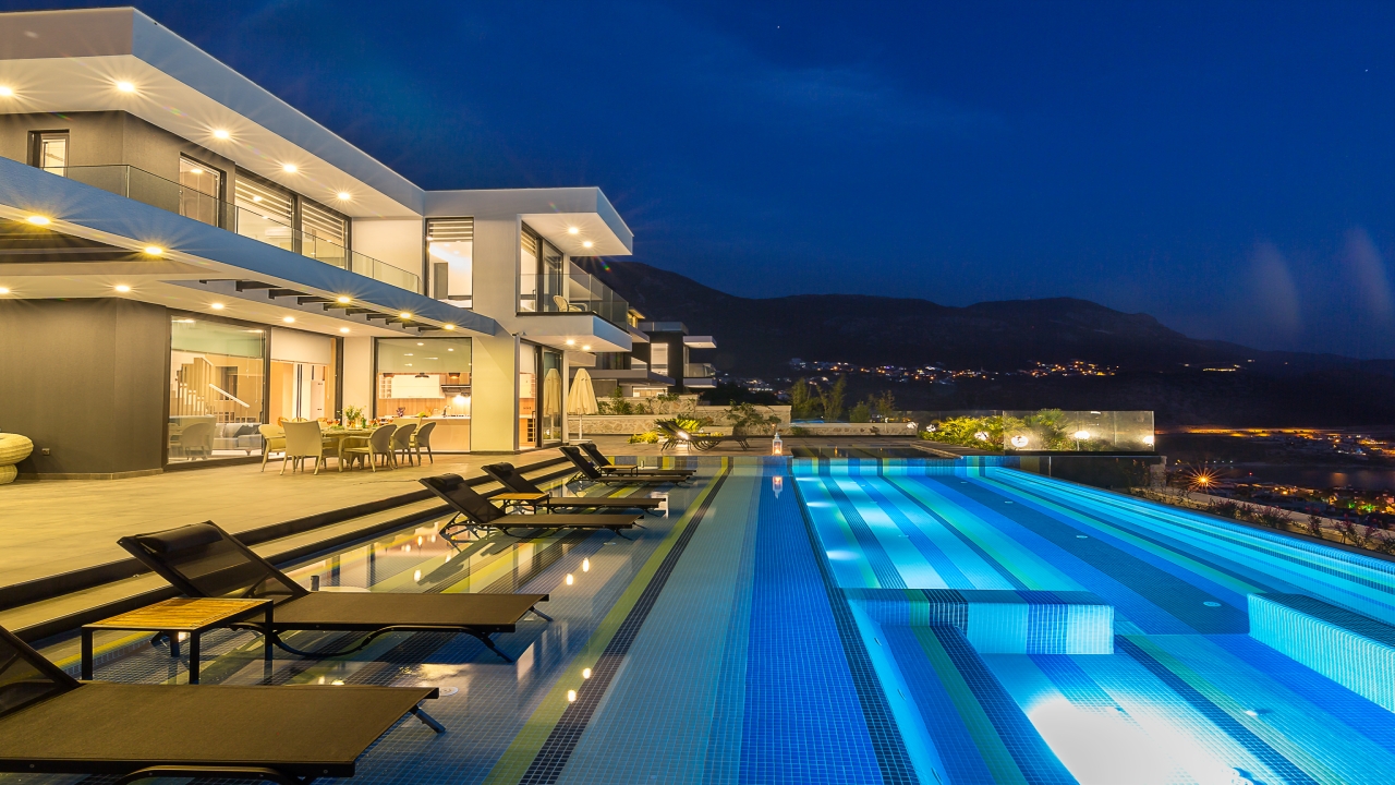 Villa Panorama Kalkan is true to its name and offers incredible turquoise vistas from wherever you are on the property. This luxury villa has an infinity pool taking pride of place in the centre of a generous terrace, with poolside loungers and an outdoor dining patio for ultimate relaxation. Multi-functional in design, the sizeable pool has been finished to include a children’s pool, a shallow pool for sun loungers, the main swimming pool, and a sunken jacuzzi area. The interior decor is chic and neutral with high-quality furnishings and an ultra-modern fitted kitchen with an indoor dining area. Finished to a high standard, the interior comprises a spacious living area and kitchen which opens out onto the private pool terrace. Full-height glass windows on either side of this space give a bright and airy feel to this room. A comfortable seating area with satellite TV allows to you unwind at night. The fitted kitchen is well-equipped and features an island with an integrated dining...