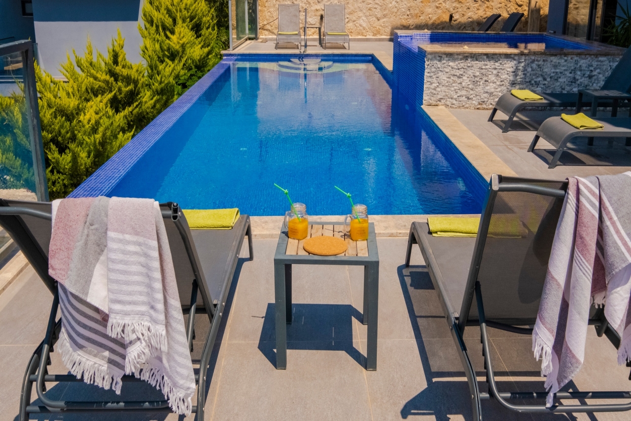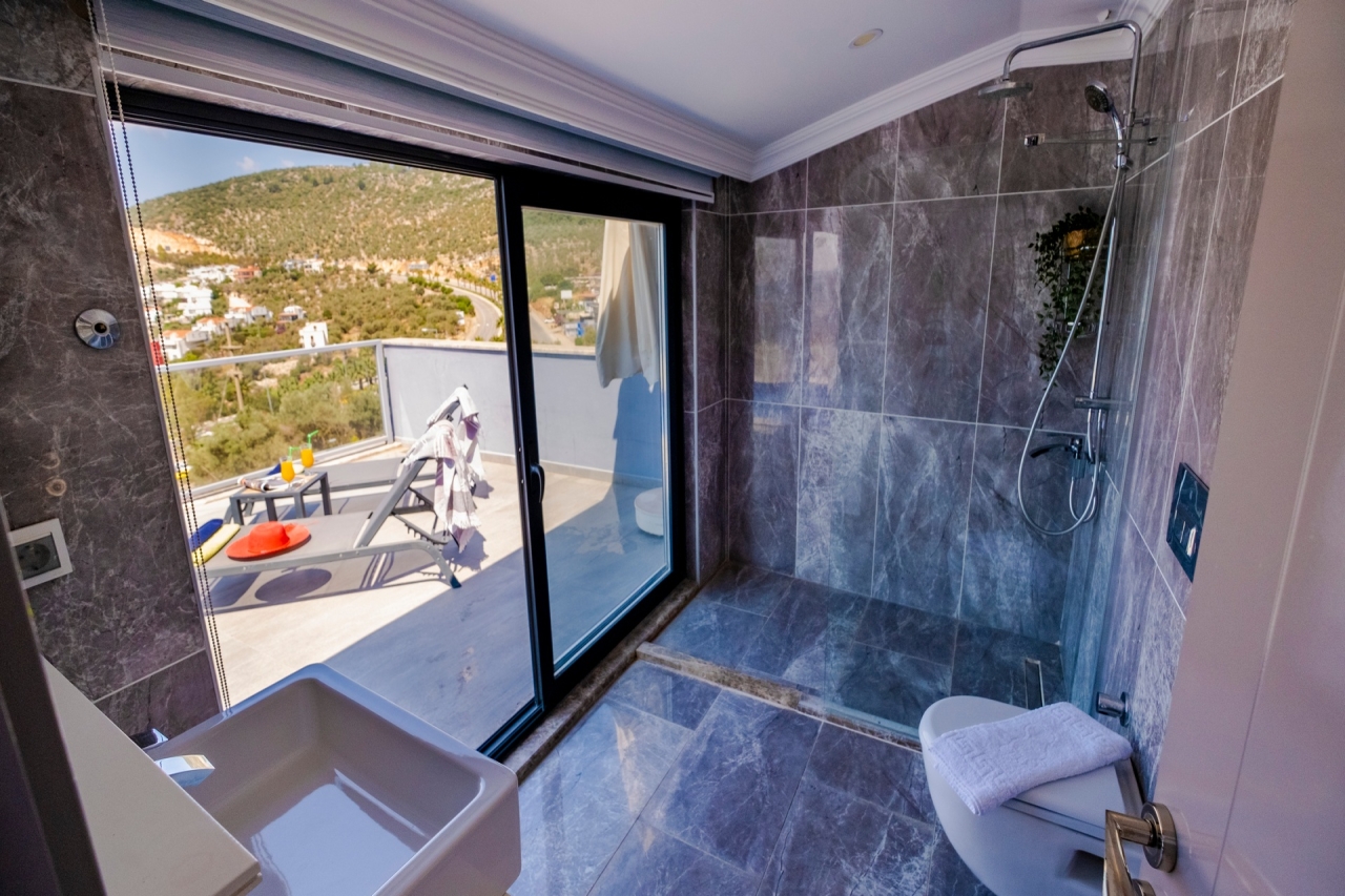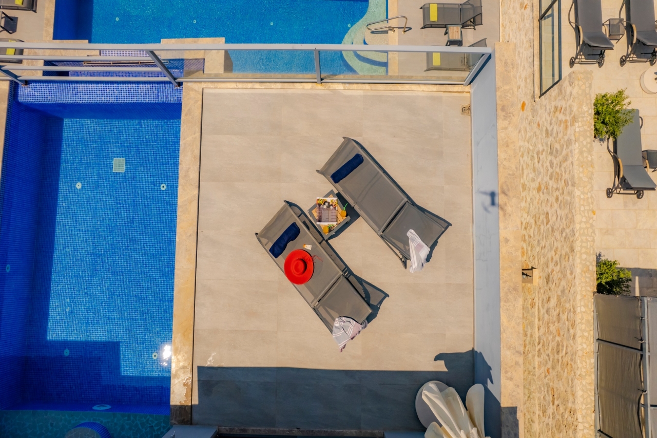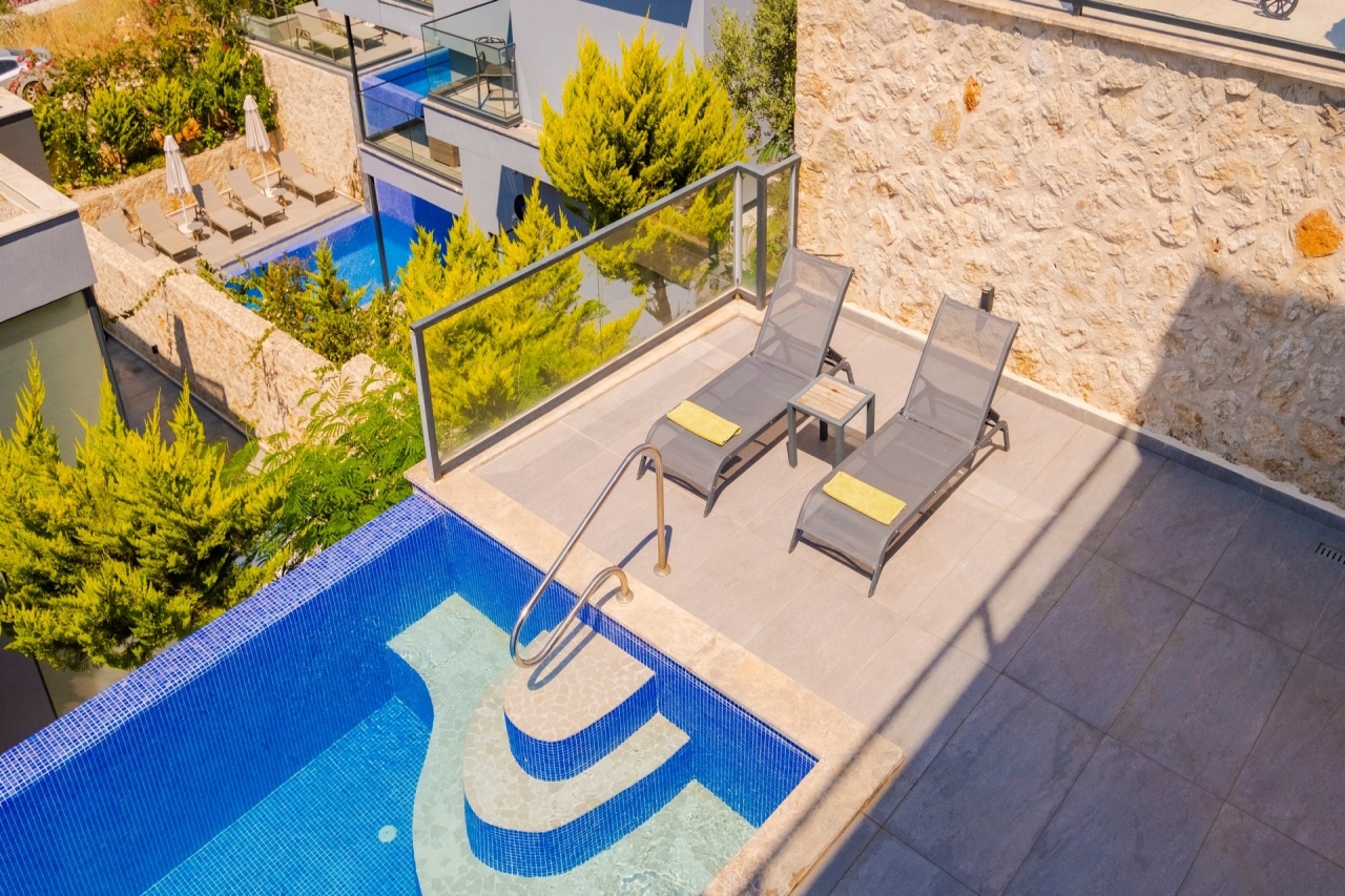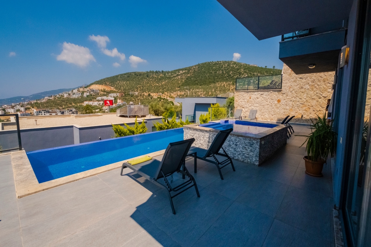 Villa Waterfall 1 stands out as an elegant property in Kalkan's Kiziltas district. It comprises 5 en-suite bedrooms, with one conveniently located on the ground floor and four arranged across the upper levels. A striking spiral staircase crafted from marble and iron connects the floors with a refined touch.The top floor is dedicated to the master bedroom, which opens directly onto the roof terrace. This private area includes a plunge pool and outdoor seating, offering expansive views that extend over the surrounding landscape.Inside, the villa embraces an open-plan layout that feels both spacious and inviting. The living room and kitchen on the ground floor benefit from abundant natural light streaming through a towering double-height window, which frames the vista of the pool terrace beautifully.Wide sliding doors open onto a generous pool terrace featuring an infinity pool. It’s an ideal spot for dining al fresco or enjoying a barbecue, all while taking in the panoramic mountain...