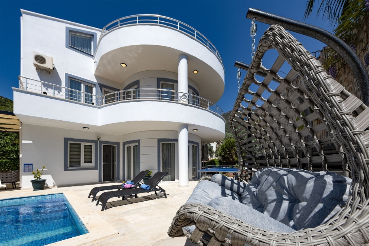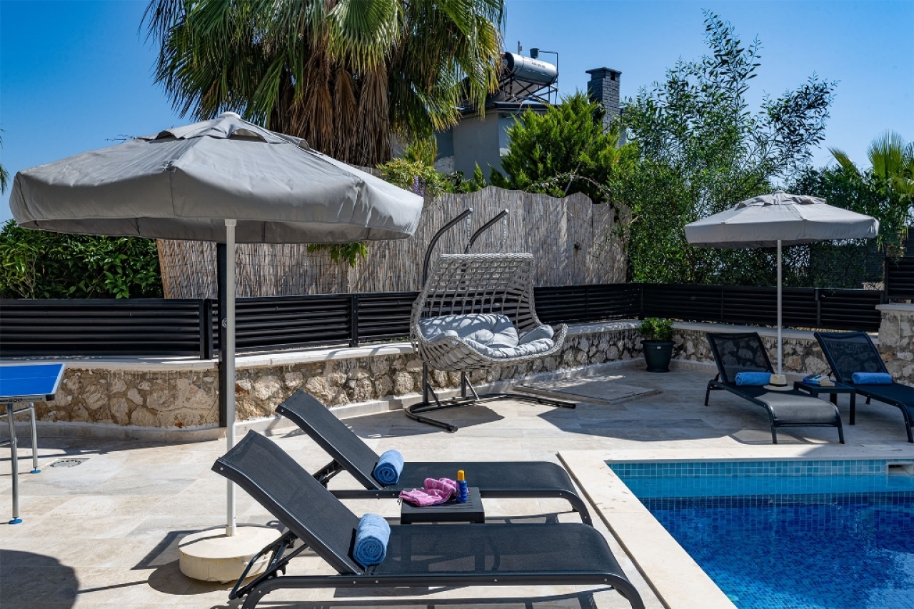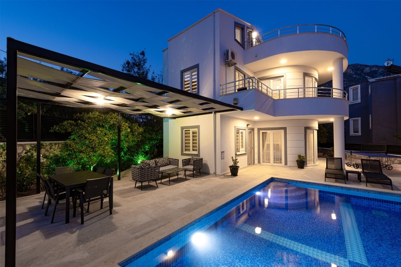 Situated in Kalkan's Ortaalan area, Villa Zafira offers a superb balance of location and privacy for those seeking a peaceful retreat. The villa accommodates up to six guests across three bedrooms, including a double bedroom complete with a jacuzzi. A downstairs cloakroom is also available. Inside, the décor is modern and inviting, featuring a fully equipped kitchen alongside a dining area designed for relaxed meals. Outside, the generous sun terrace provides ample space to unwind, centred around a private salt water swimming pool. Guests can enjoy sun loungers, parasols, a swing seat, outdoor seating, a BBQ, and even a table tennis table. Kalkan town centre is within a 15-20 minute stroll or just a 3-4 minute taxi ride, while the Migros supermarket is easily reached on foot in around 10-15 minutes.Bedrooms1. First floor, the master bedroom offers a double bed, bedside table, air conditioning, wardrobe, vanity table, and an en-suite bathroom with WC. French doors open onto a...